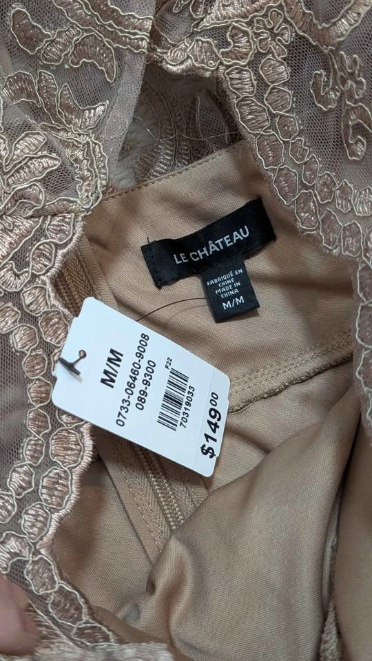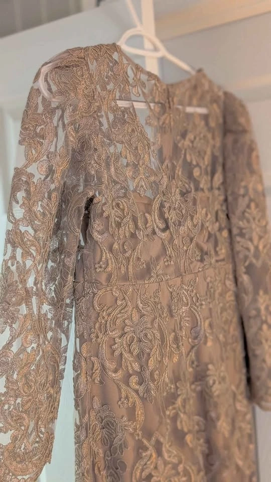 Gorgeous formal mermaid gown in taupe with beautiful intricate lace overlay. Features three-quarter sleeves and a scalloped V-neck design. New with tags still on. Size M. $80 Firm. Pickup in Newmarket.