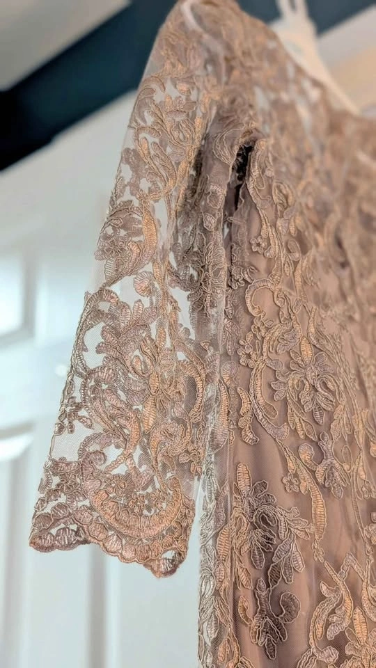 Gorgeous formal mermaid gown in taupe with beautiful intricate lace overlay. Features three-quarter sleeves and a scalloped V-neck design. New with tags still on. Size M. $80 Firm. Pickup in Newmarket.