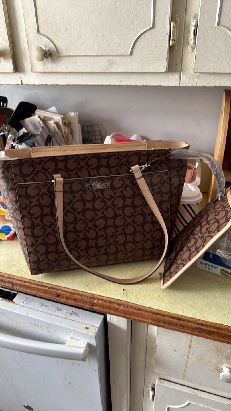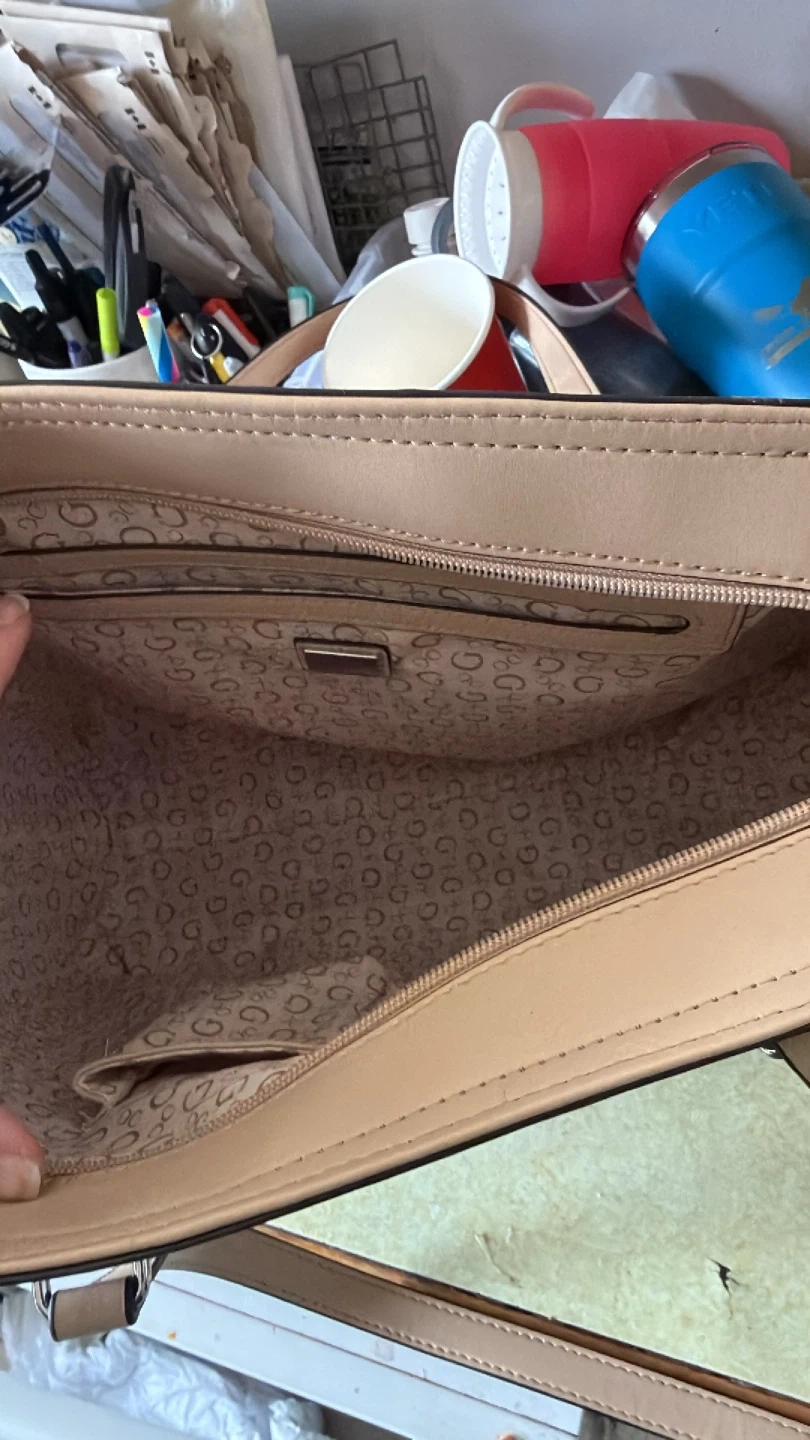 This is a Guess tote bag with a repeating "G" pattern. It has a tan interior and tan strap accents. It's a stylish bag for everyday use!
