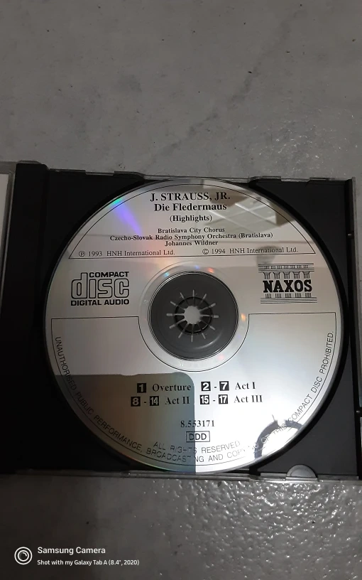 Selling a J. Strauss Jr. Die Fledermaus Highlights CD. It features the Bratislava City Chorus and the Czech-Slovak Radio Symphony Orchestra, conducted by Johannes Wildner. This CD includes tracks from the opera, such as the Overture, Act I, Act II, and Act III. Enjoy the classic compositions of Strauss!