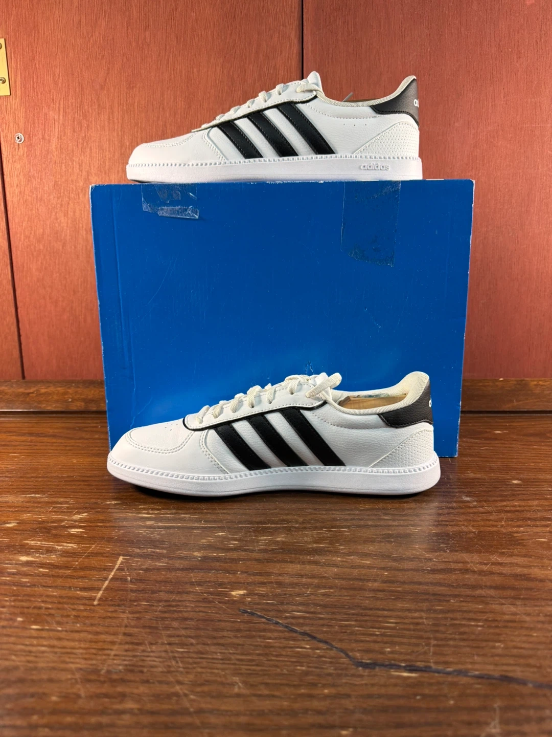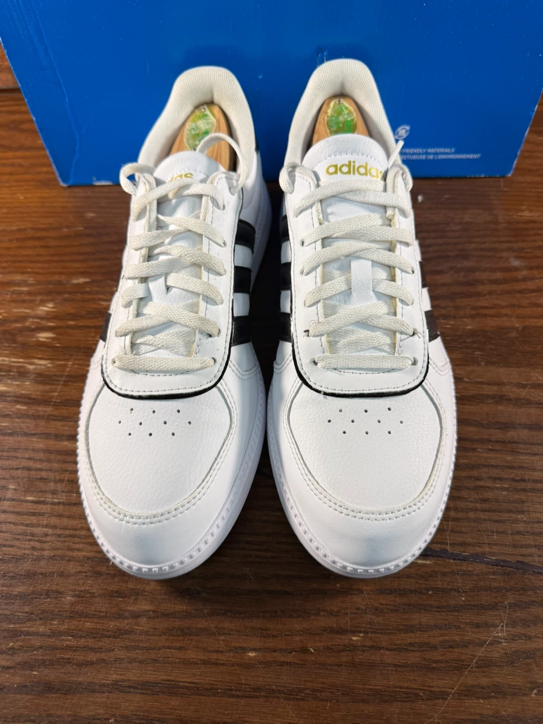 These sleek, white sneakers feature the classic Adidas three-stripe design in black, offering a stylish and sporty look.