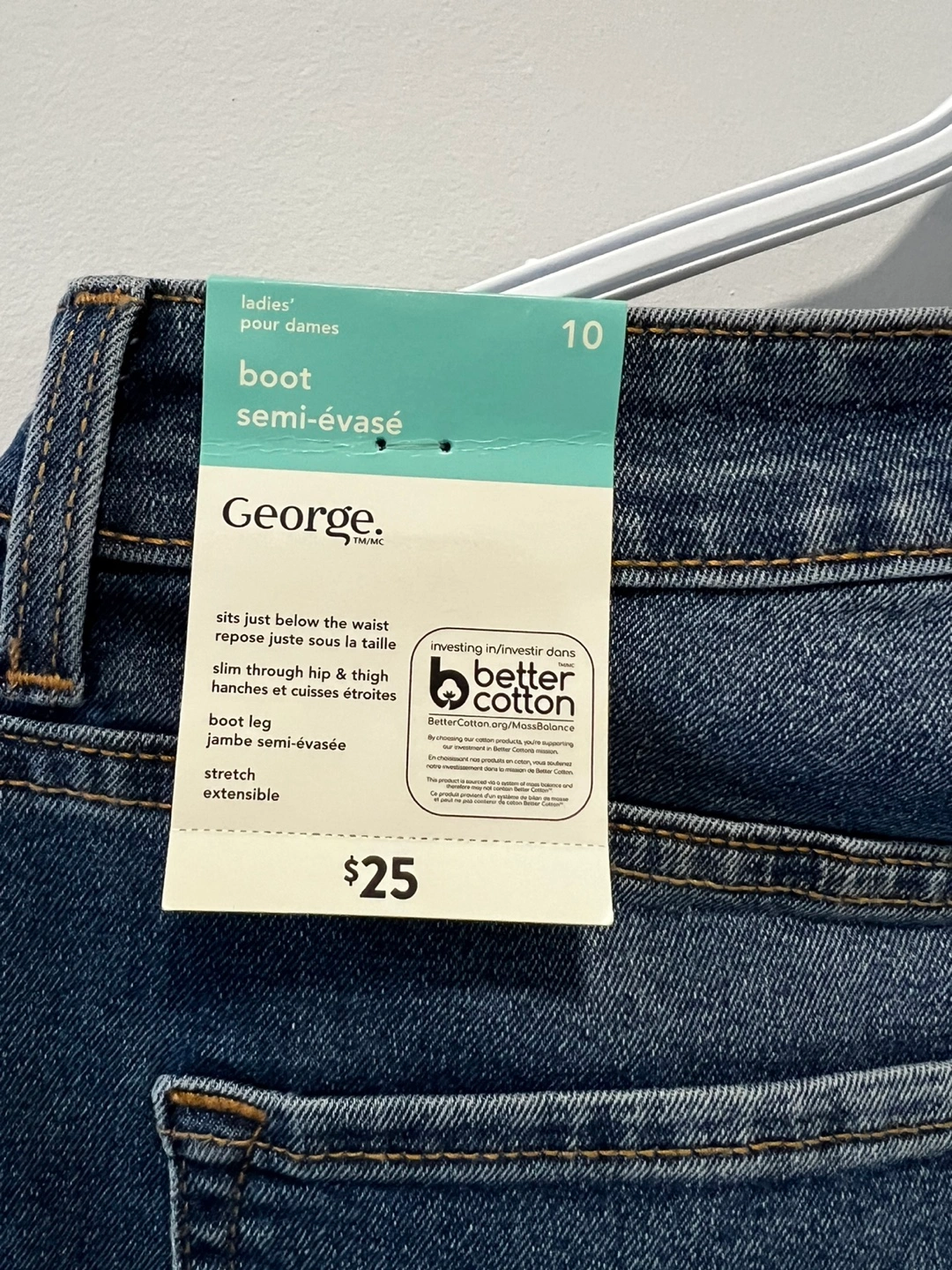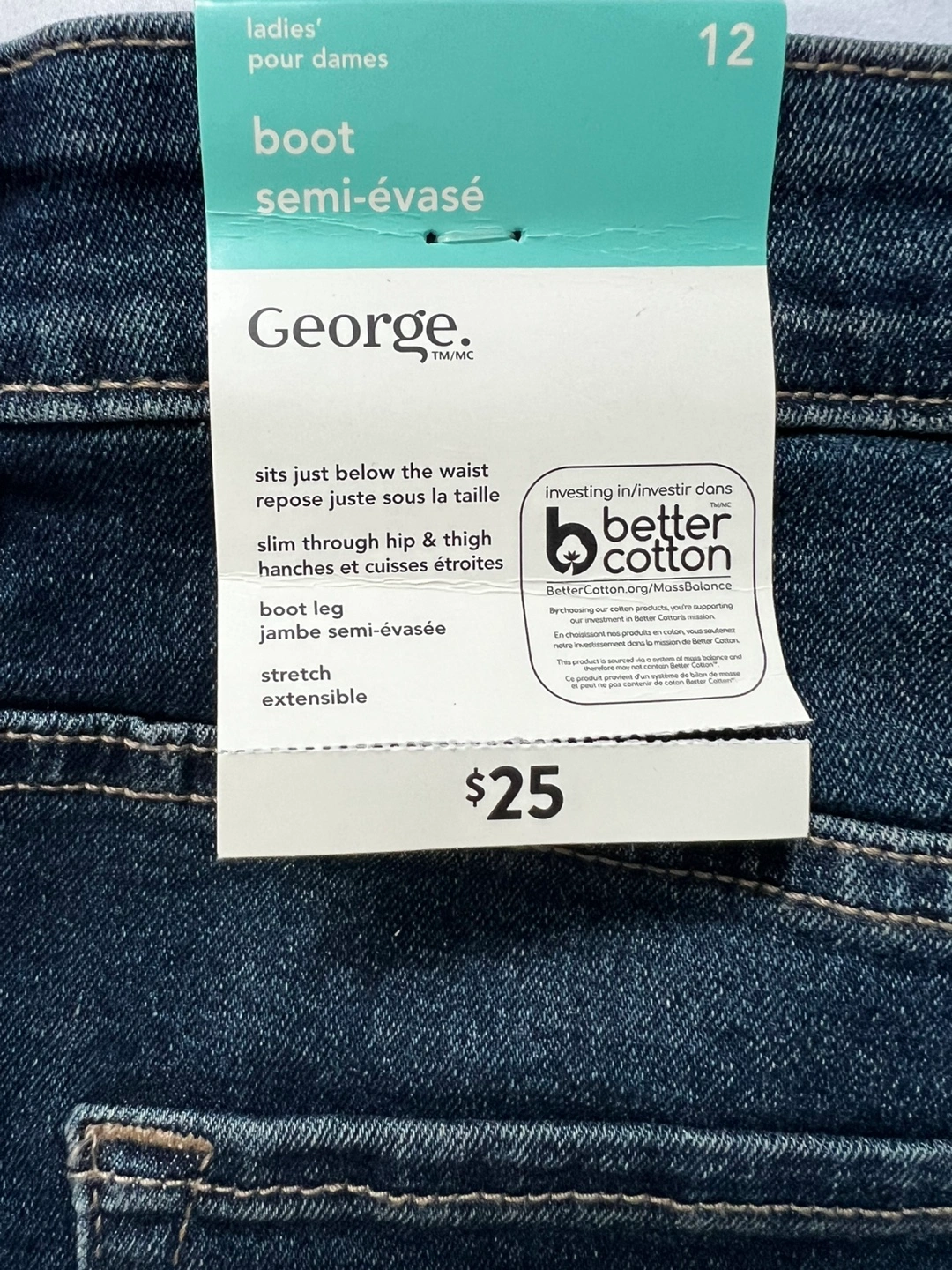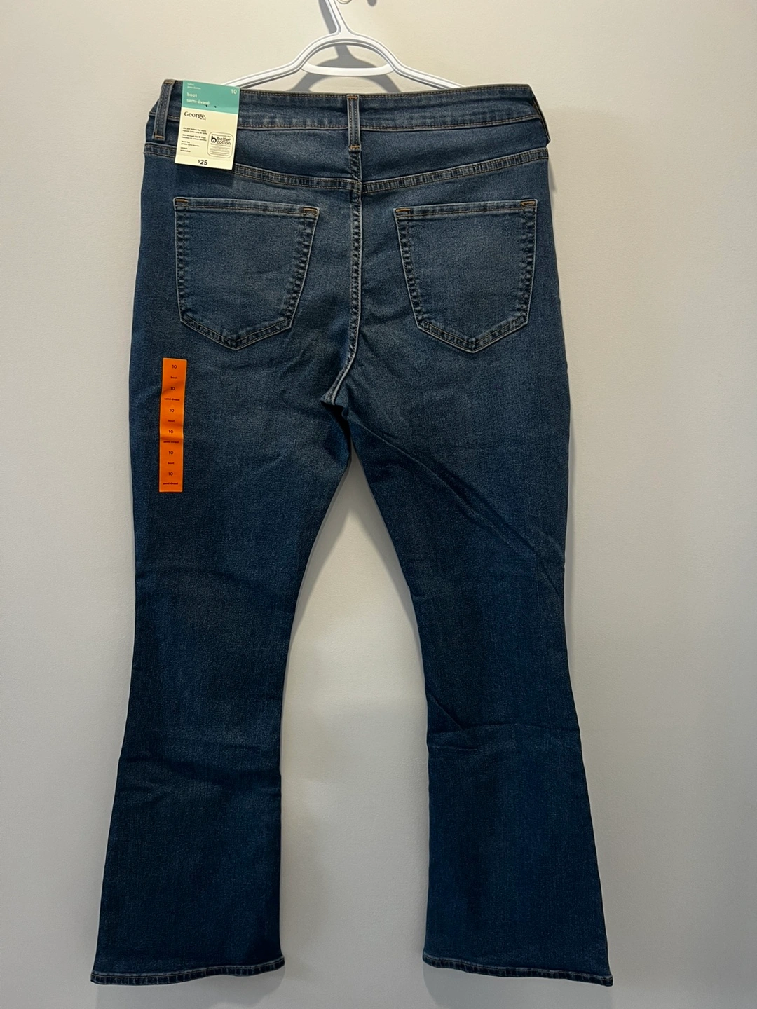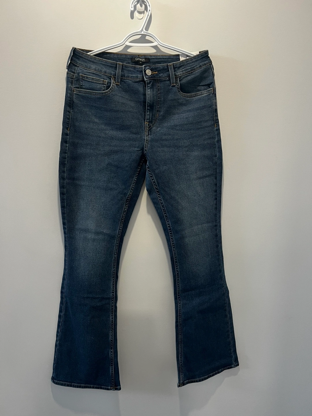 George ladies' boot leg jeans. Available in sizes 10, 12, and 14, these jeans sit just below the waist with a slim through hip & thigh. They're made with stretch denim for comfort.