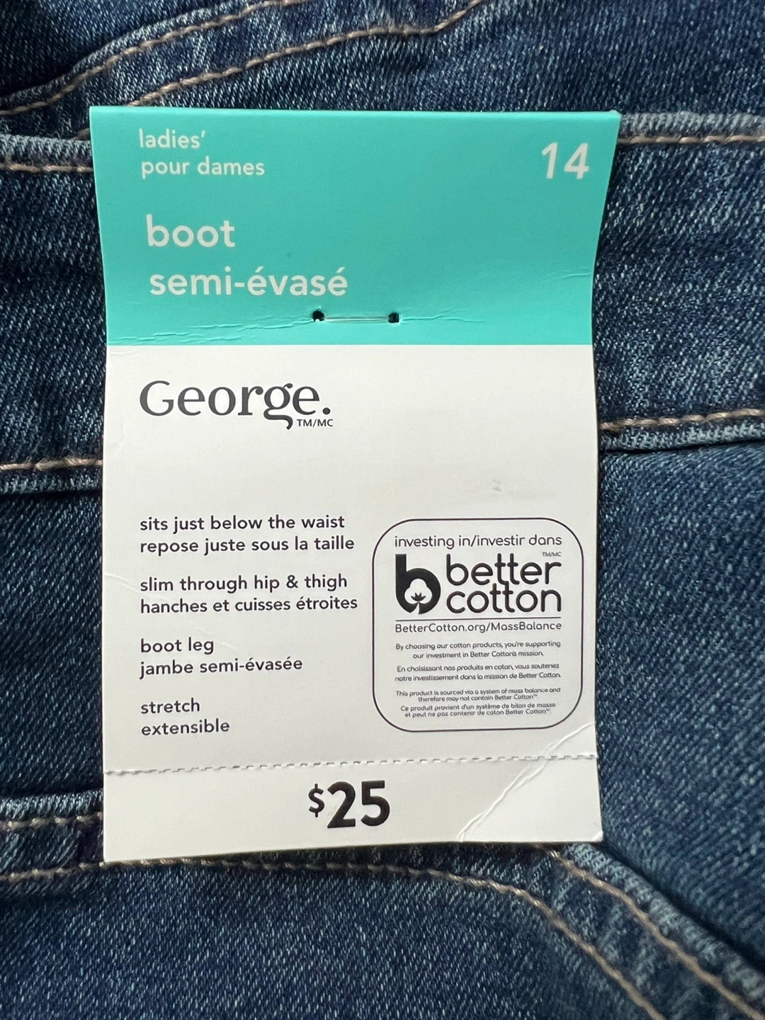 George ladies' boot leg jeans. Available in sizes 10, 12, and 14, these jeans sit just below the waist with a slim through hip & thigh. They're made with stretch denim for comfort.