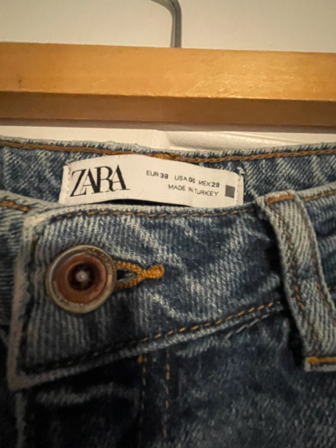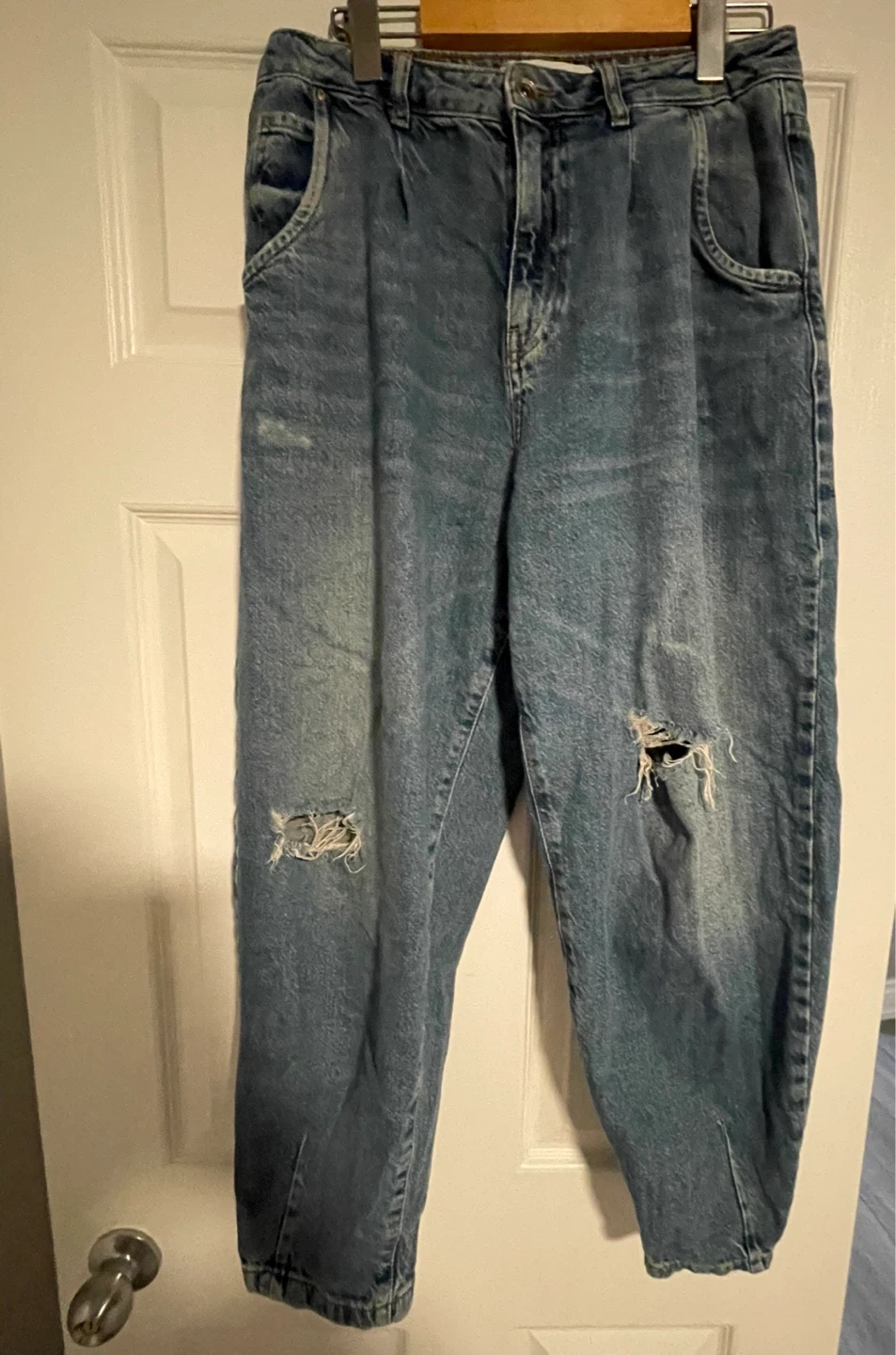 These ZARA jeans are a stylish blue denim with a distressed, ripped look. They're a loose-fit style with a zip and button closure. Size is US 6 (EUR 38, MEX 28).