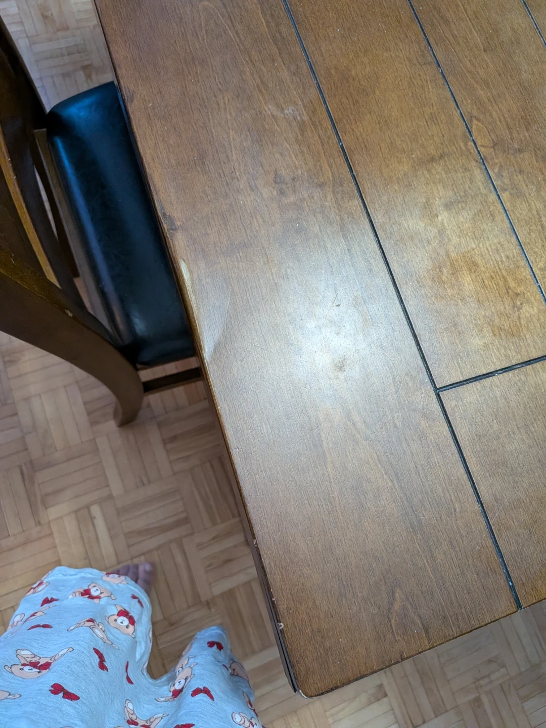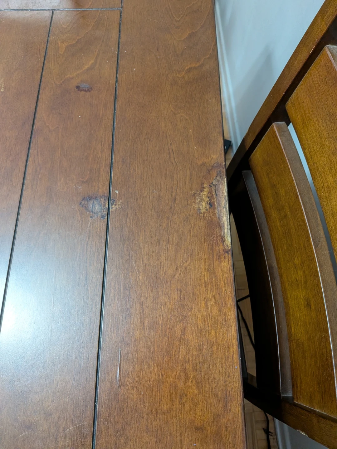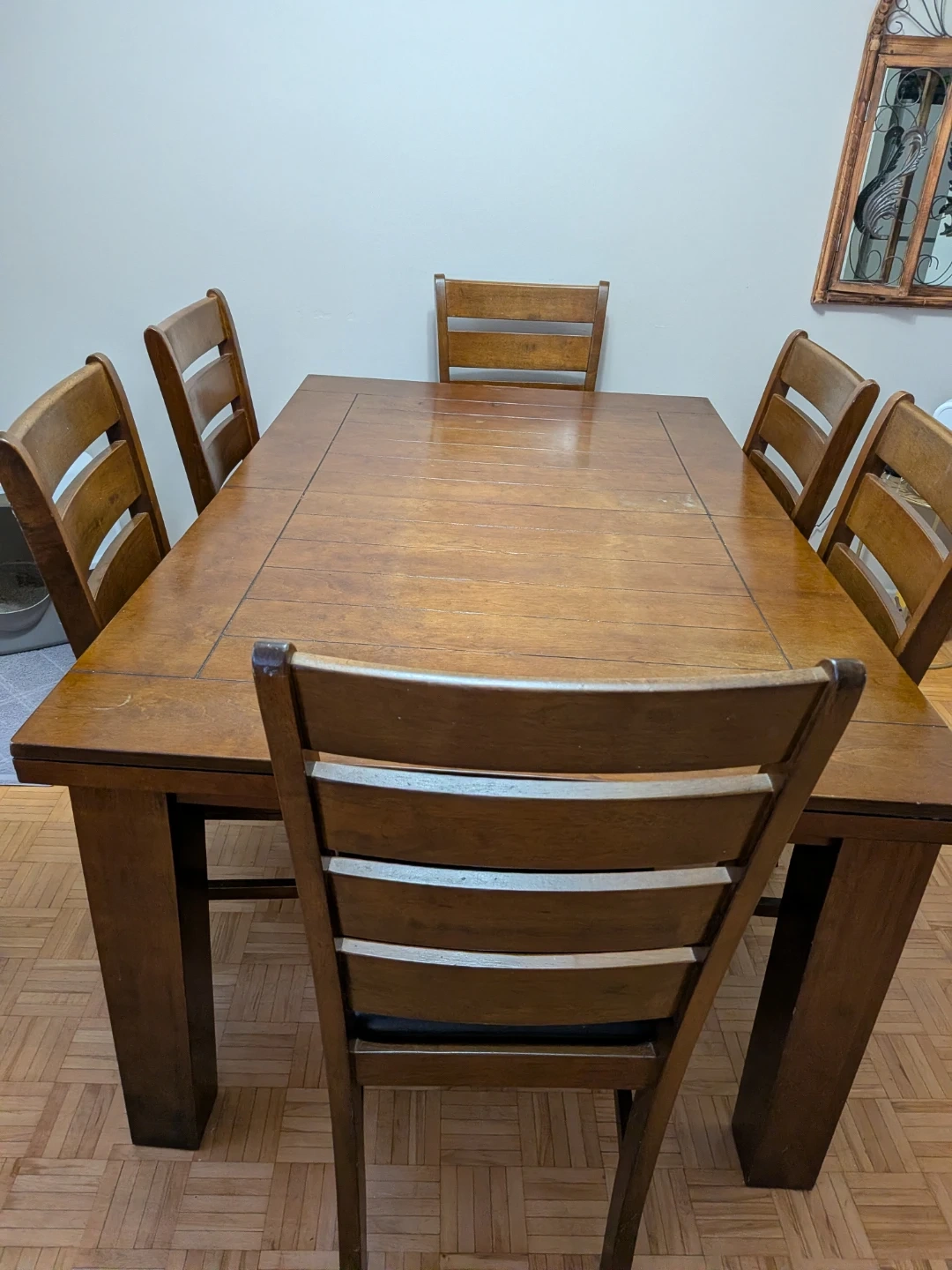 A classi c solid wooden dining table that seats 8 people. It's made of durable wood and comes with 8 matching chairs. This set is perfect for family dinners or gatherings!