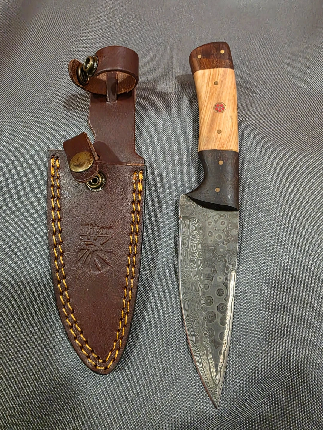 Here's a Titan Damascus steel knife, complete with a brown leather sheath! The sheath has nice yellow stitching around the edges and a snap closure. The handle is made of light and dark wood with decorative metal accents. It's a beautiful knife for any collector or outdoor enthusiast!