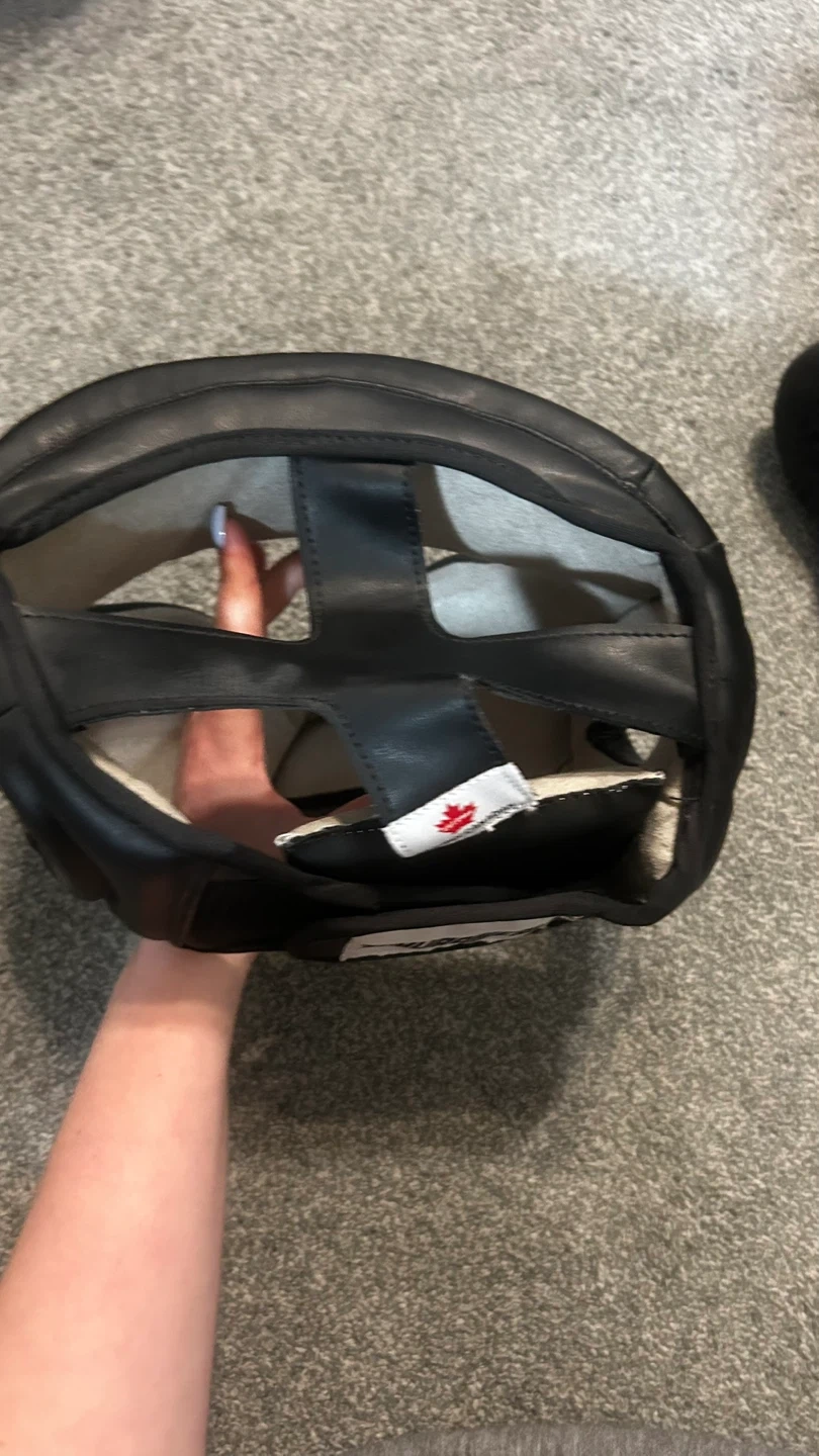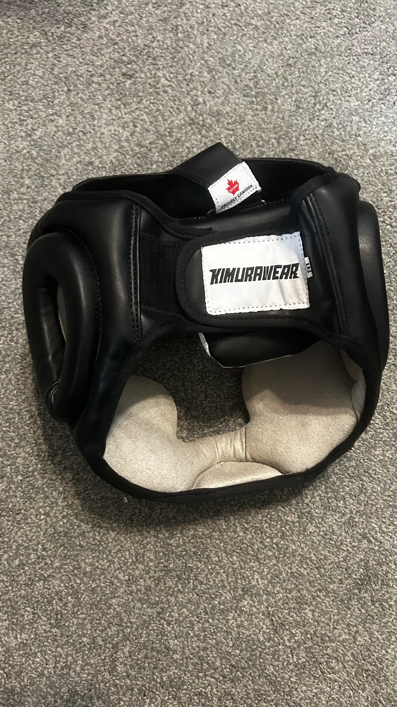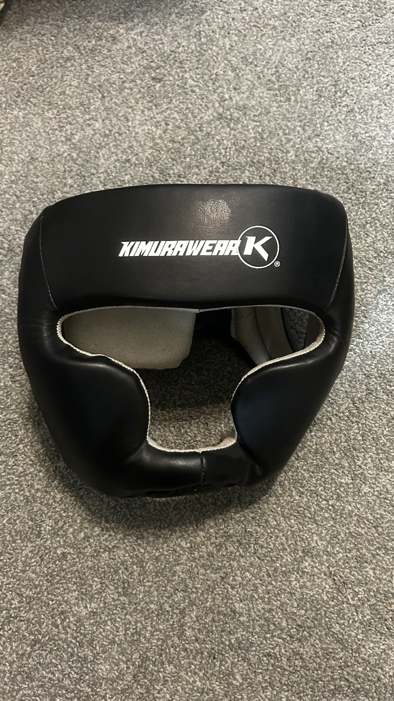This is a black KimuraWear boxing headgear. It's made with leather and has adjustable straps for a secure fit. The interior is padded for comfort and protection.