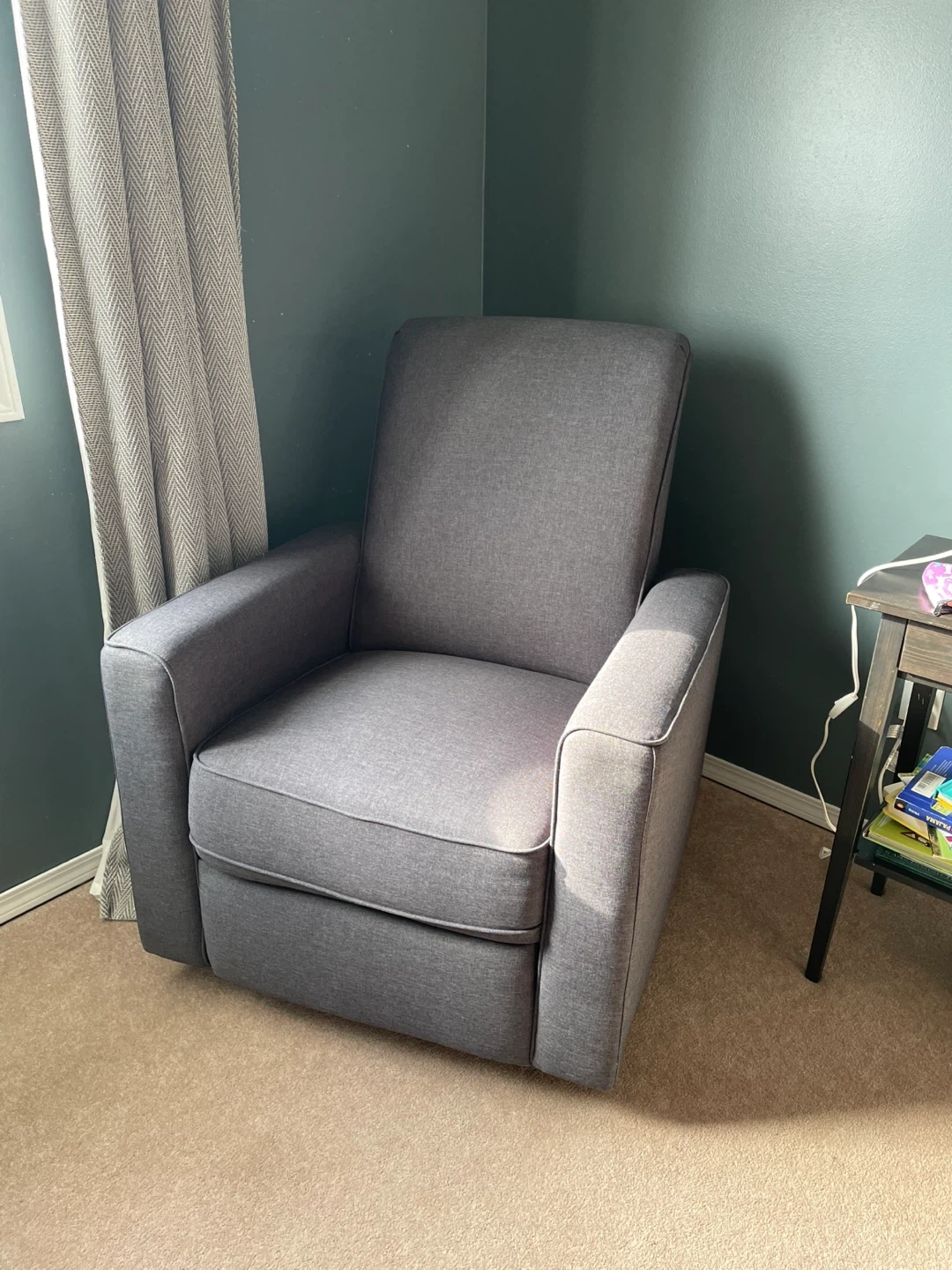 Grey swivel rocker recliner. A perfect nursing chair for a nursery.