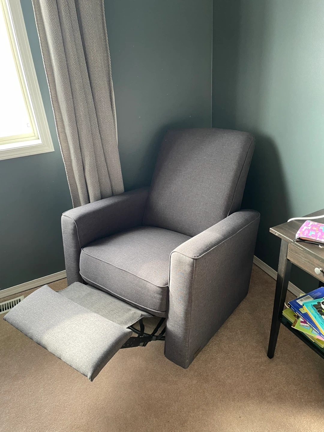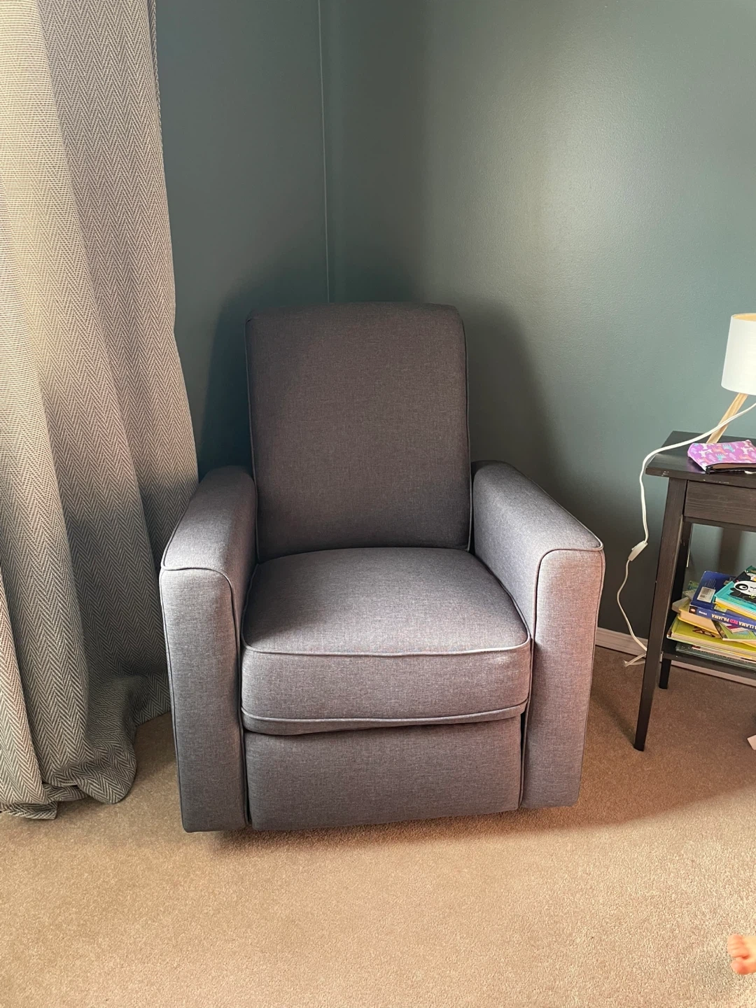 Grey swivel rocker recliner. A perfect nursing chair for a nursery.