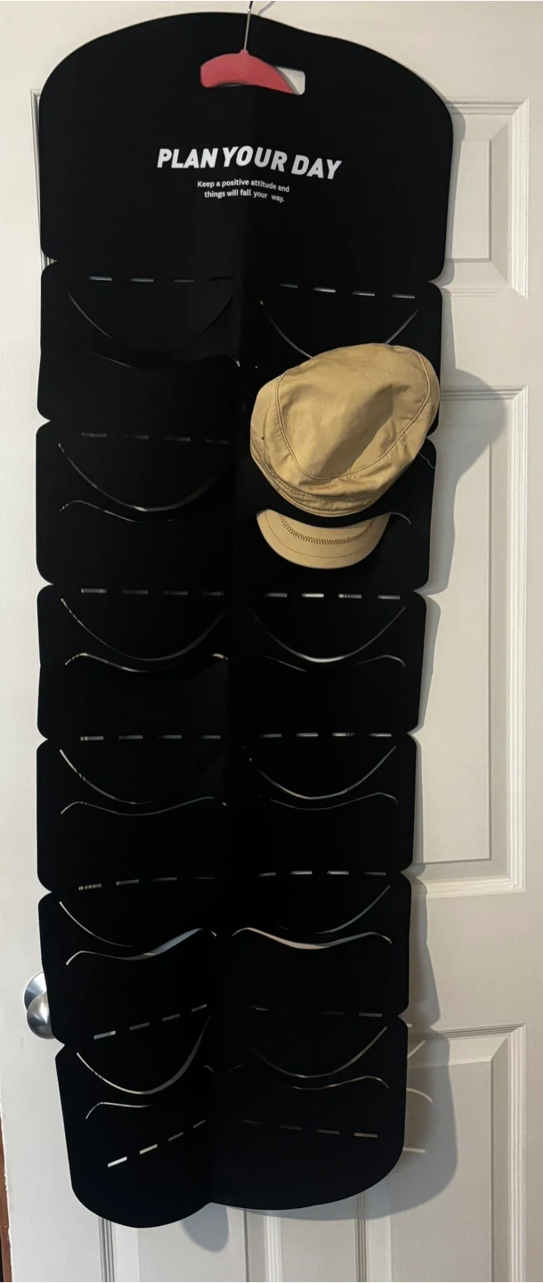 Many available new in bag. Black or white available. Handy hat organizer. Great for keeping your hats neat and tidy. Has 12 slots for all your baseball caps or other hats. Top says 'PLAN YOUR DAY Keep a positive attitude and things will fall your way.' Located on the south side of Edmonton close to Calgary Trail and 23ave.
