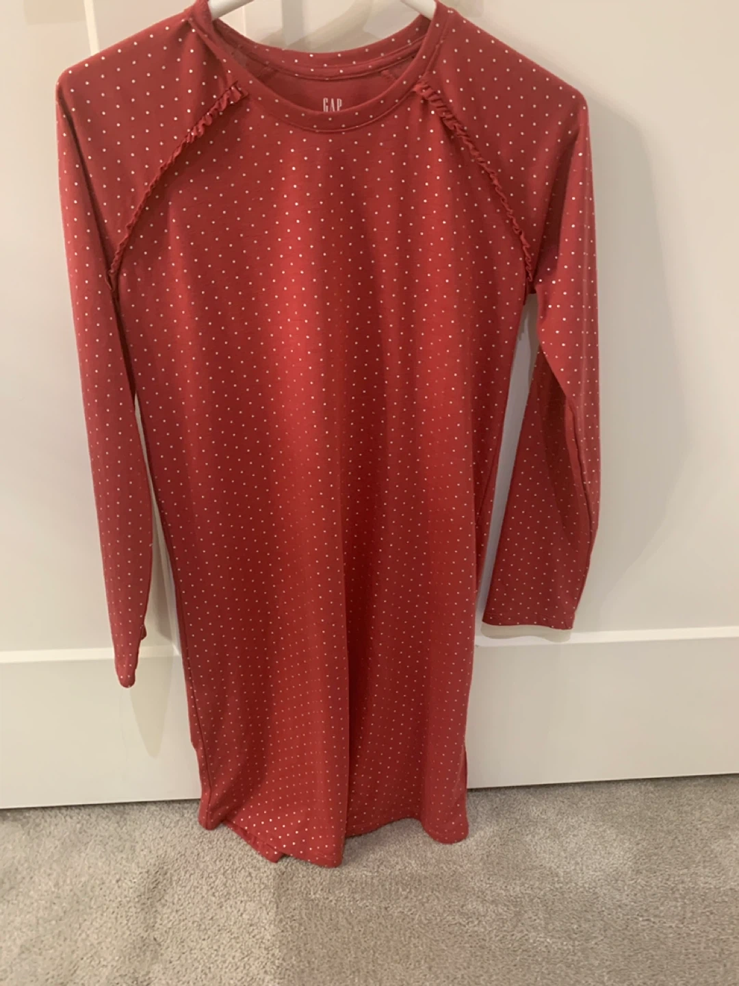 Gap Kids long-sleeve dress in a rusty red colour with white polka dots. It's a size medium. Cotton blend material. Perfect for casual wear!