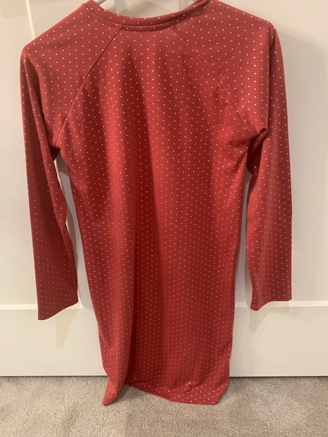 Gap Kids long-sleeve dress in a rusty red colour with white polka dots. It's a size medium. Cotton blend material. Perfect for casual wear!