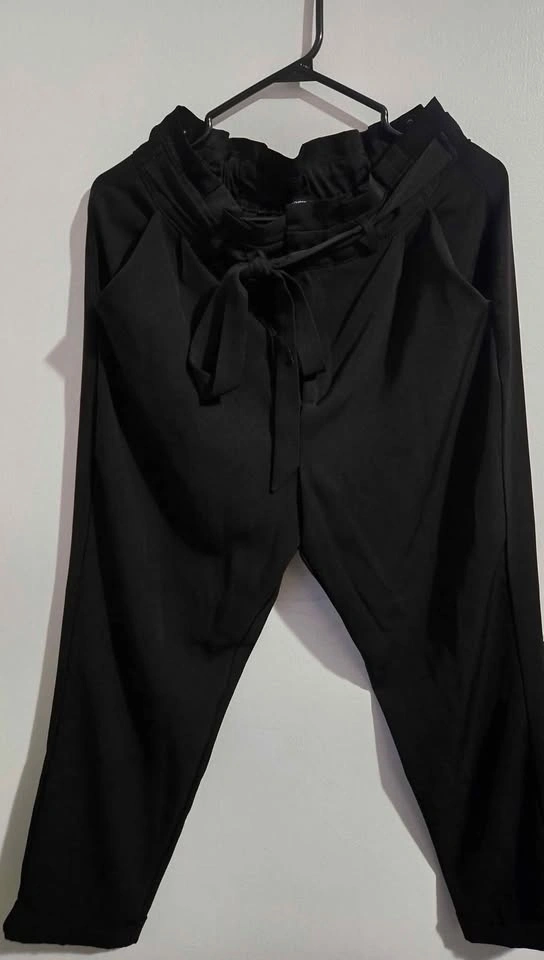 Black pants are medium, paperbag style, ankle length.