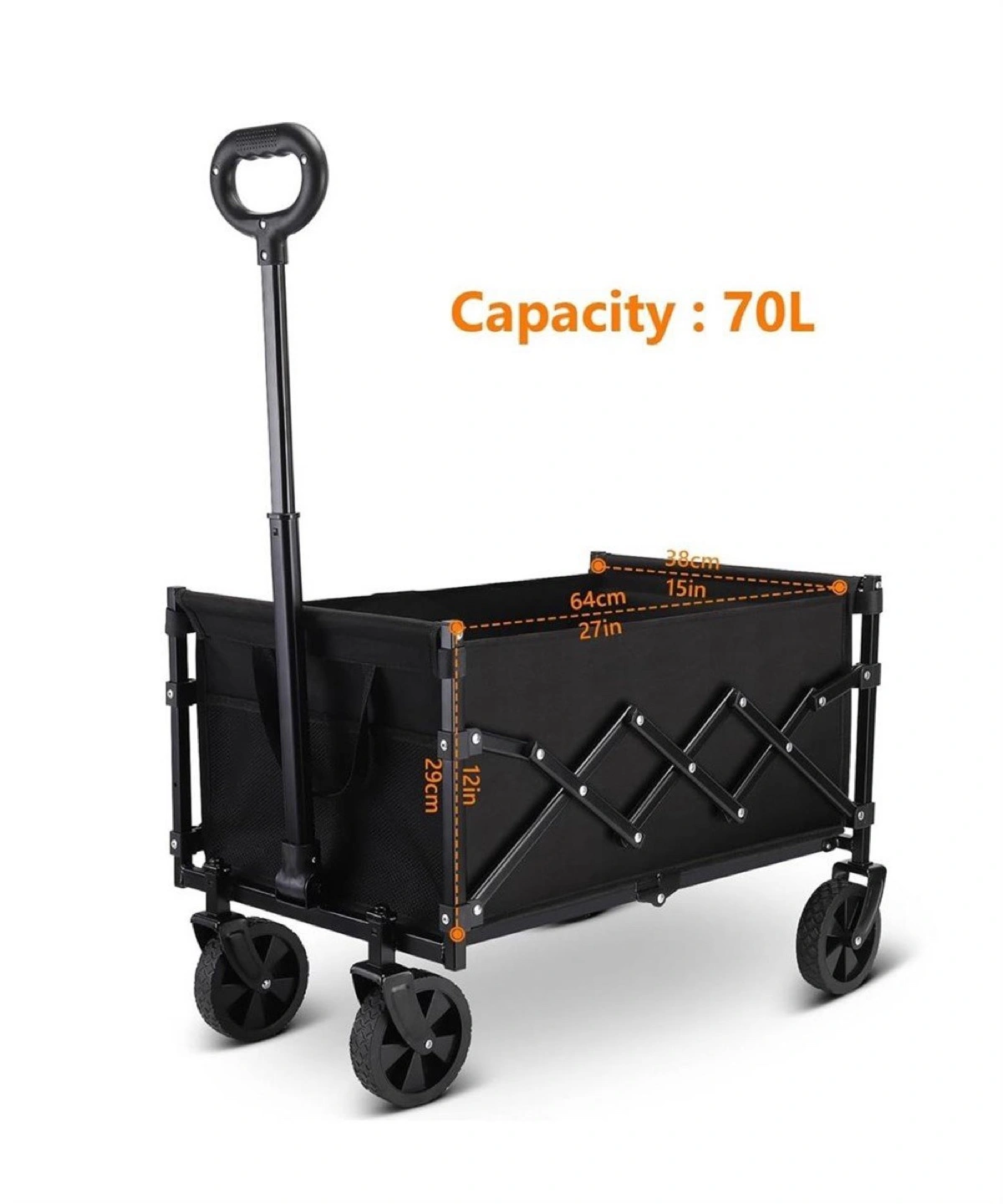 This handy collapsible wagon is perfect for hauling groceries, camping gear, or anything else you need to move around! It has a 70L capacity and folds up for easy storage. The dimensions are approximately 27 inches long, 15 inches wide, and 12 inches high.