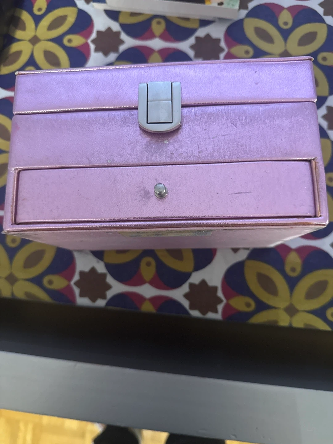 A cute pink jewellery box is up for grabs! It has a handle on top and a little drawer at the bottom for extra storage. Perfect for keeping your treasures safe and organized
