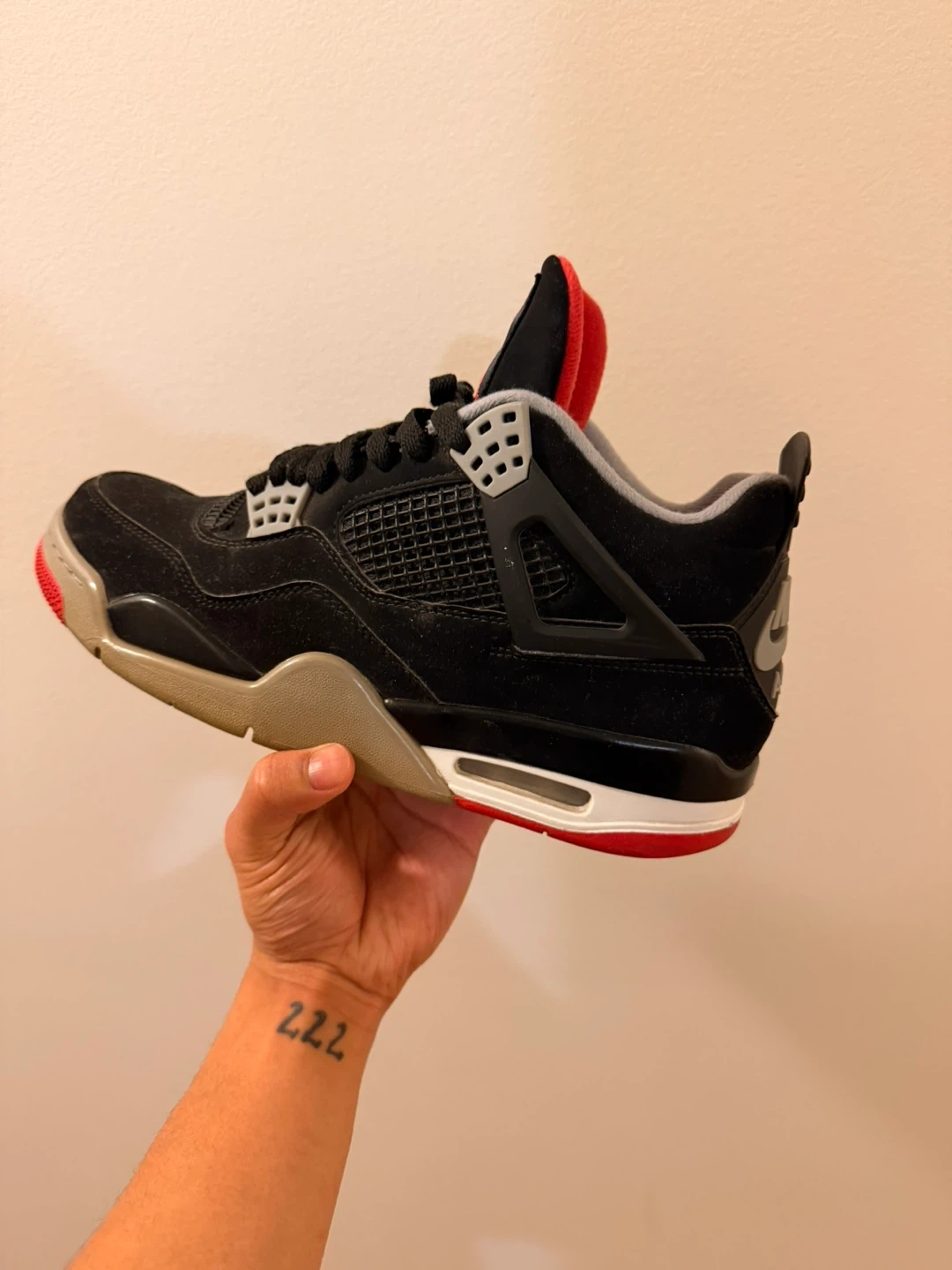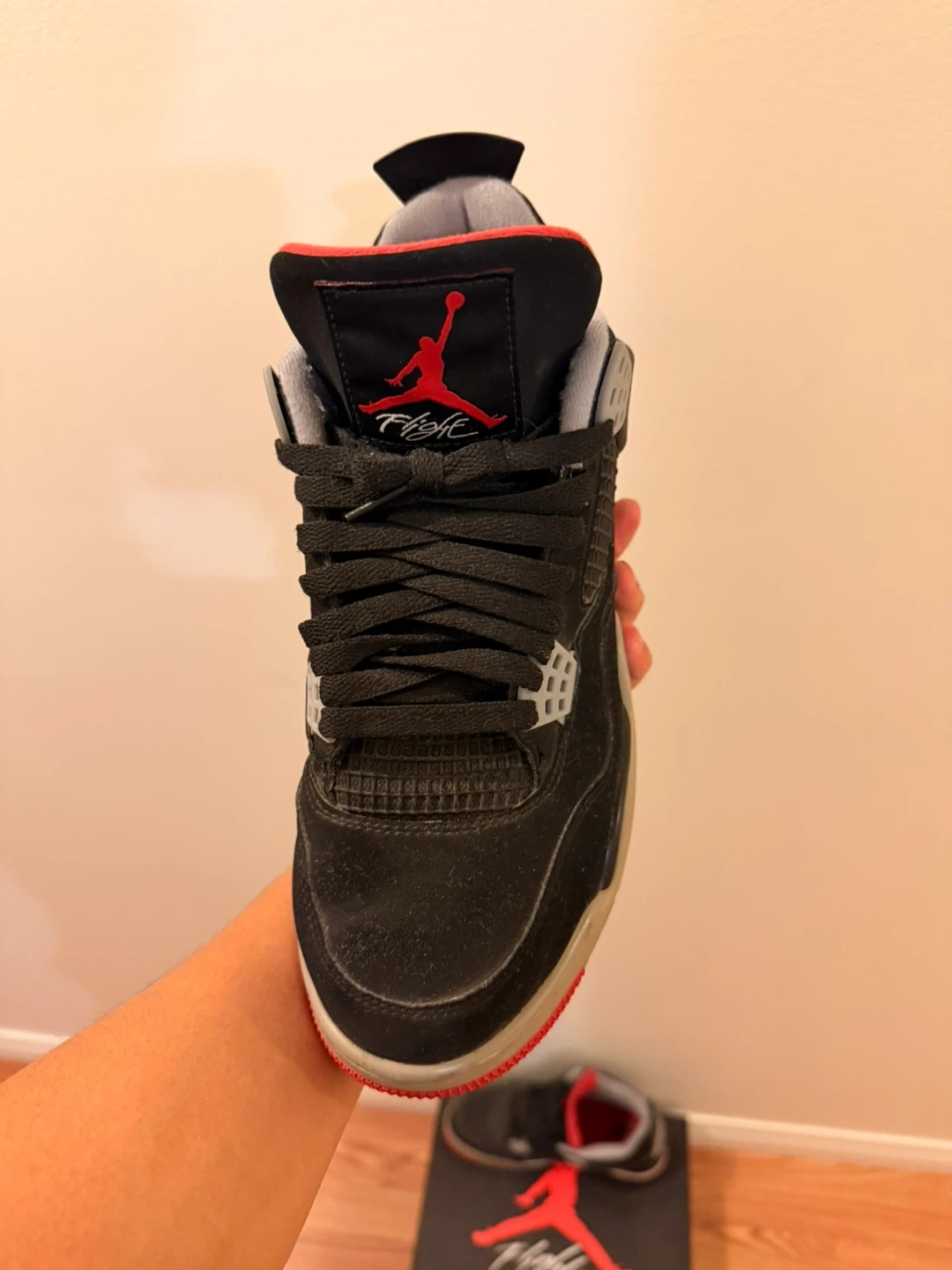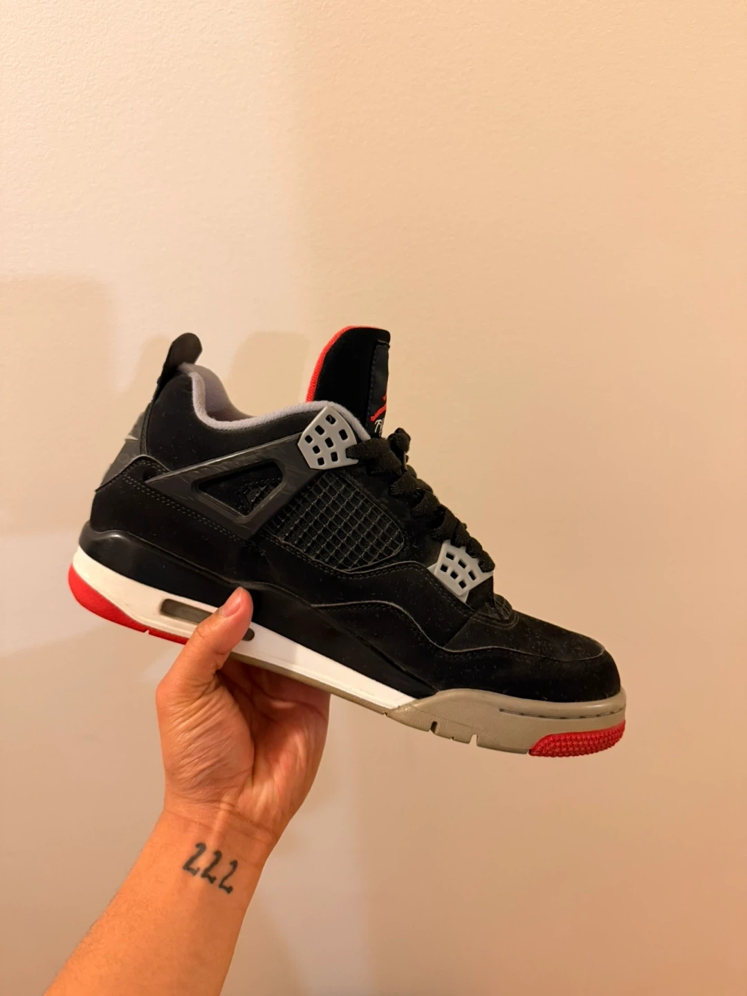 A pair of Air Jordan 4 "Bred" sneakers in black and red. These shoes feature a nubuck upper and rubber sole. Comes with the original box.