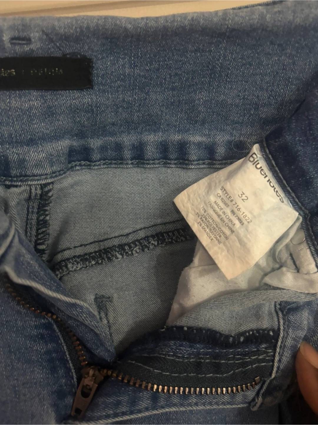 Selling a pair of Blue Notes jeans in size 32! These have a stylish distressed look with rips and tears. They're made of 70% cotton, 28% polyester, and 2% spandex, so they're comfy and have a bit of stretch.