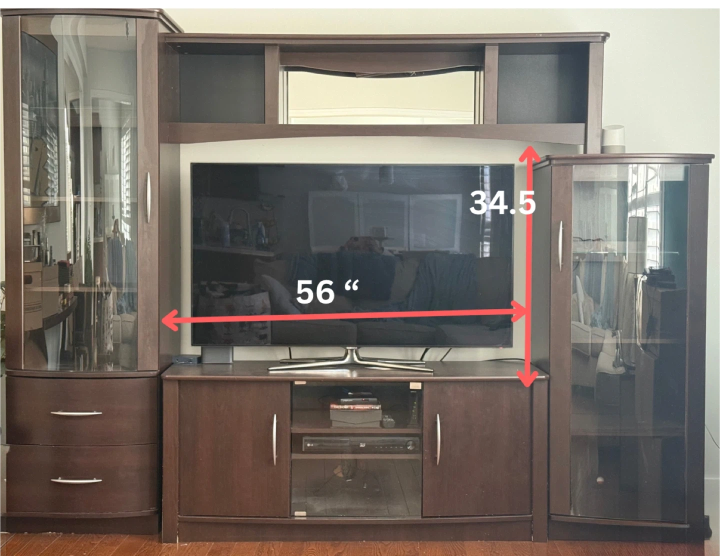 Spacious entertainment unit in a dark wood finish. Features two glass display cabinets on either side with internal shelving. The central section includes drawers and shelves for media components. Total width is 8ft, 5". Overall height of side cabinets is 76" and 56". Central TV opening is 56" wide and 34.5" high. Selling as is
