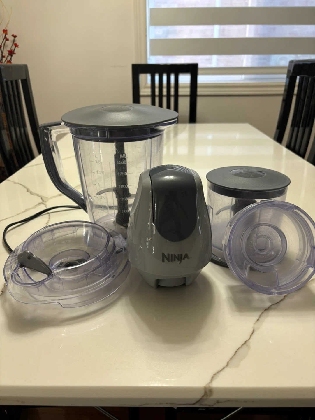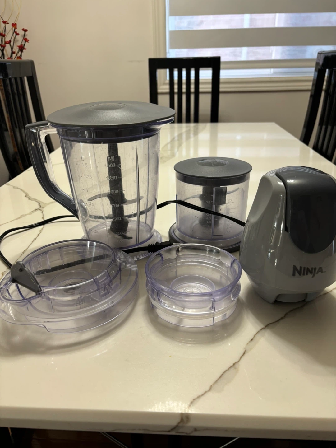 This Ninja food processor and chopper set includes a large pitcher and a smaller chopper cup. Both units have sharp blade attachments. Great for chopping vegetables or making sauces! From a pet free, vegetarian home!