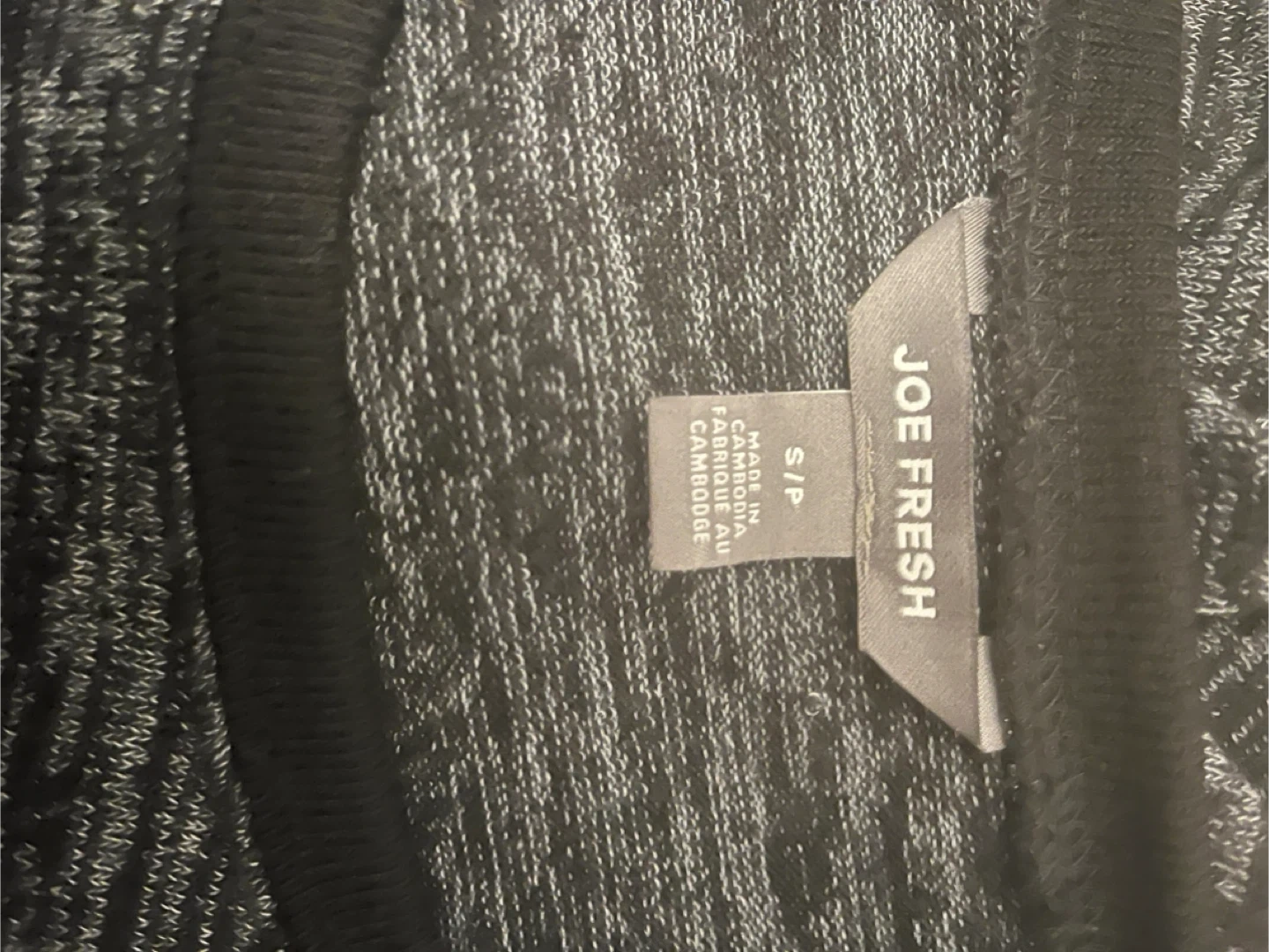 Joe Fresh women's long-sleeve dress. It's a heather grey with black sleeves. Made in Cambodia. Size S/P.