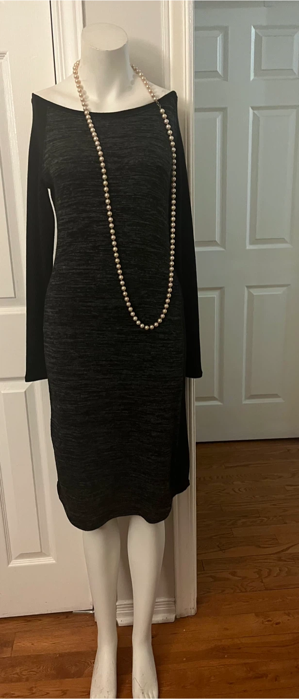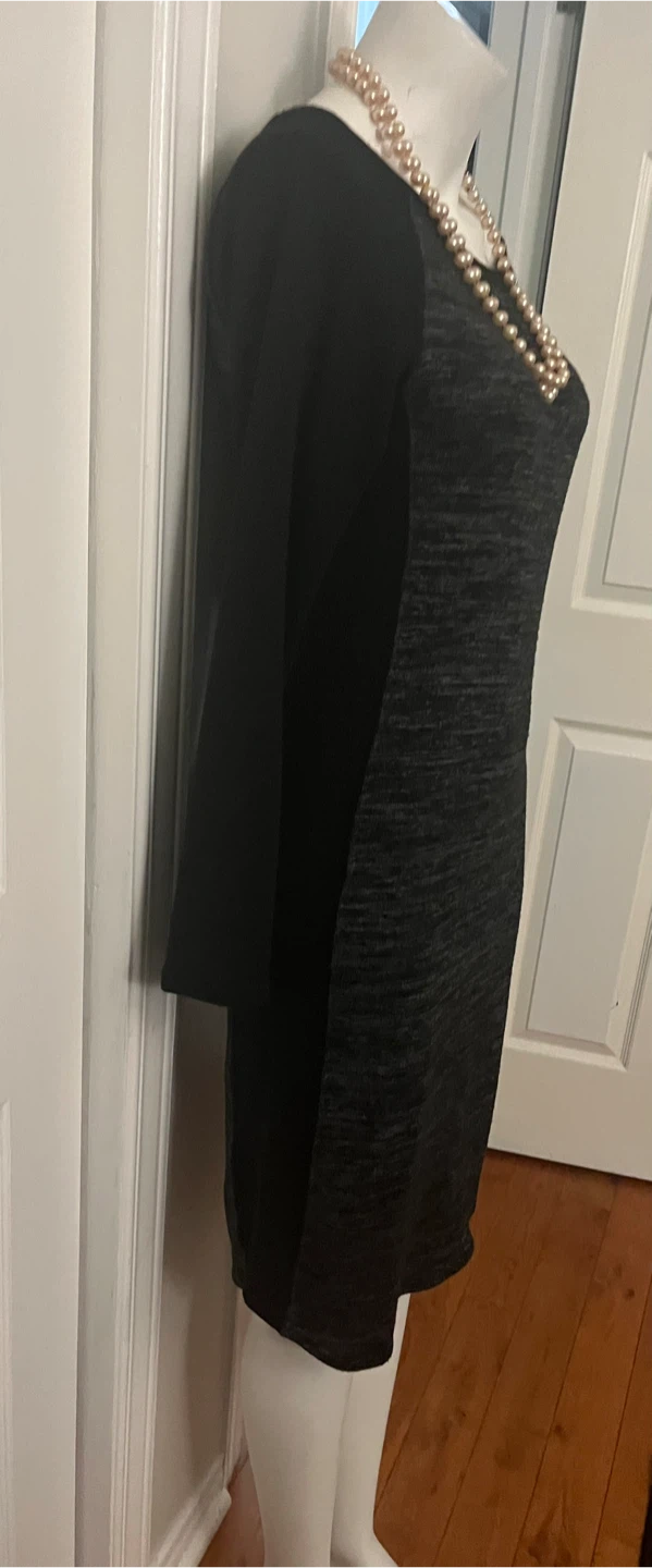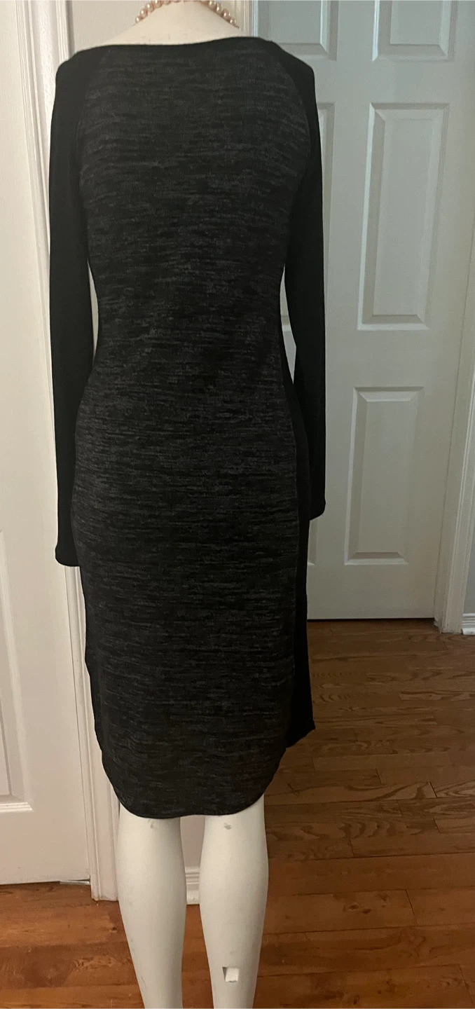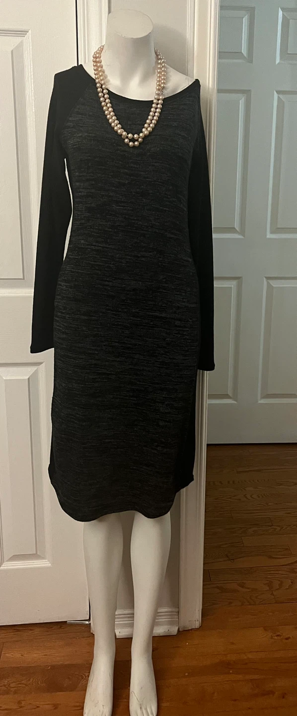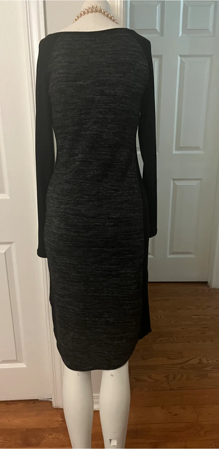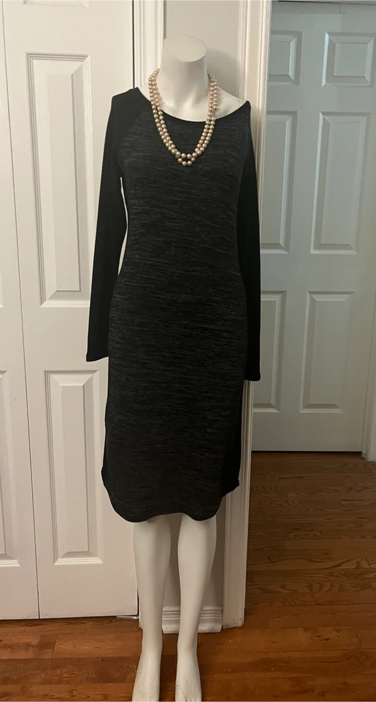 Joe Fresh women's long-sleeve dress. It's a heather grey with black sleeves. Made in Cambodia. Size S/P.