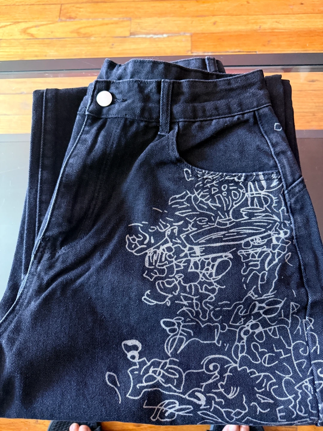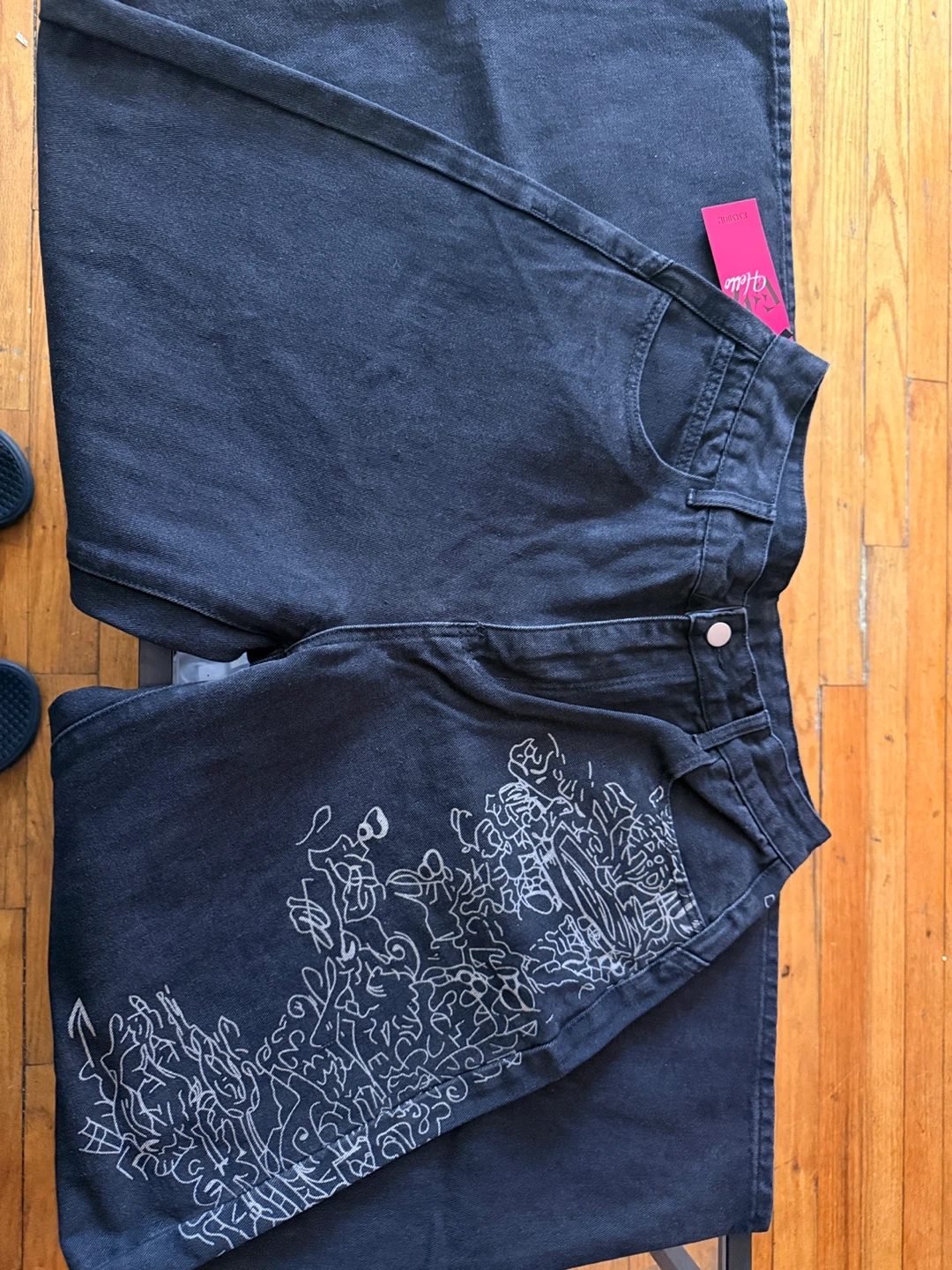 Women's Hip Hop Baggy Jeans Wide Leg Mid-Low Waist Jeans Loose Boyfriends Jeans 90s Vintage Denim Pants,Spring Clothes For Women Black denim jeans with intricate white embroidery on the back pockets and front leg. and a relaxed fit. Size Medium.