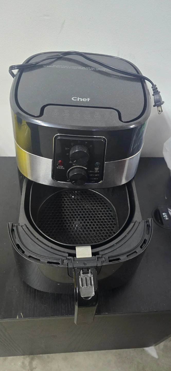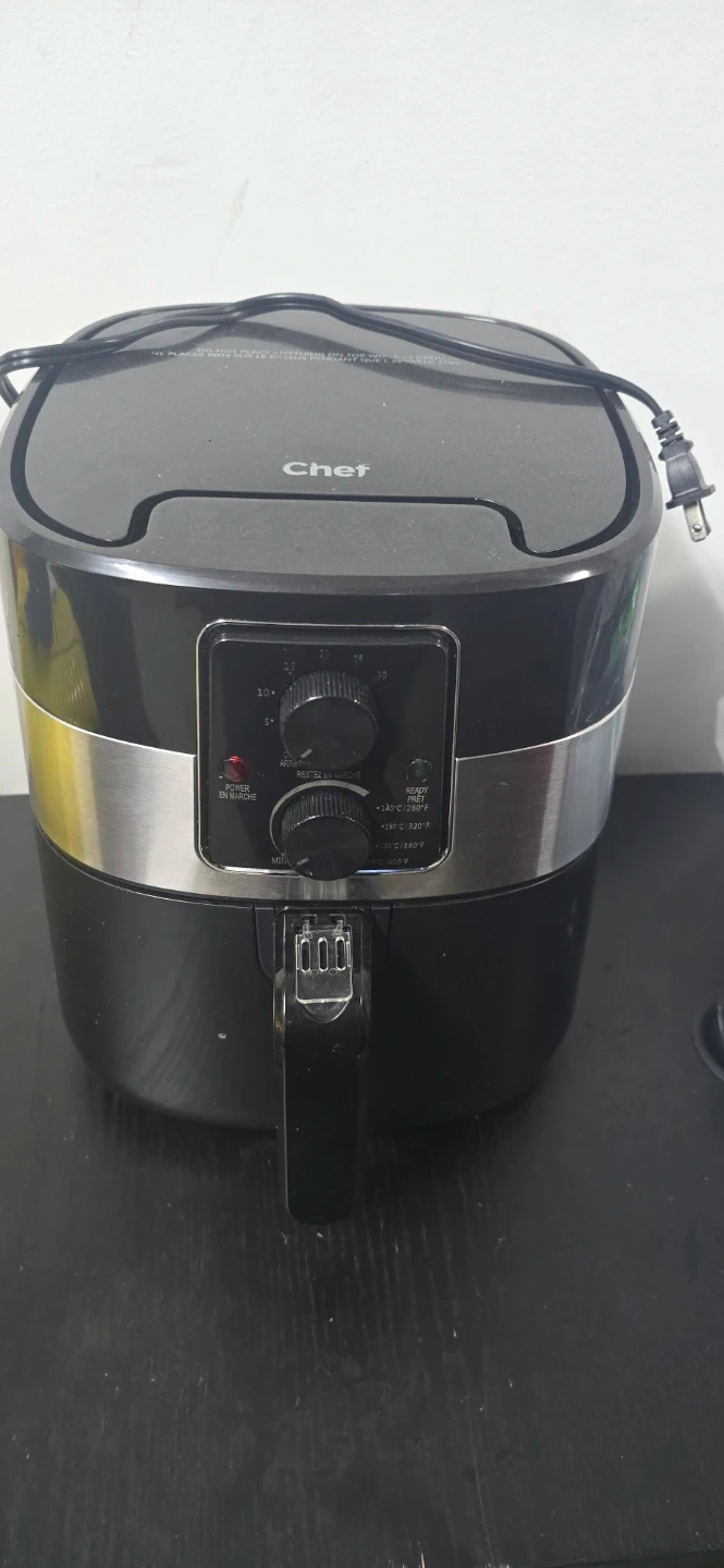 Black Chef air fryer with a stainless steel accent band. Features two control knobs for temperature and timer. It's a convenient kitchen appliance.