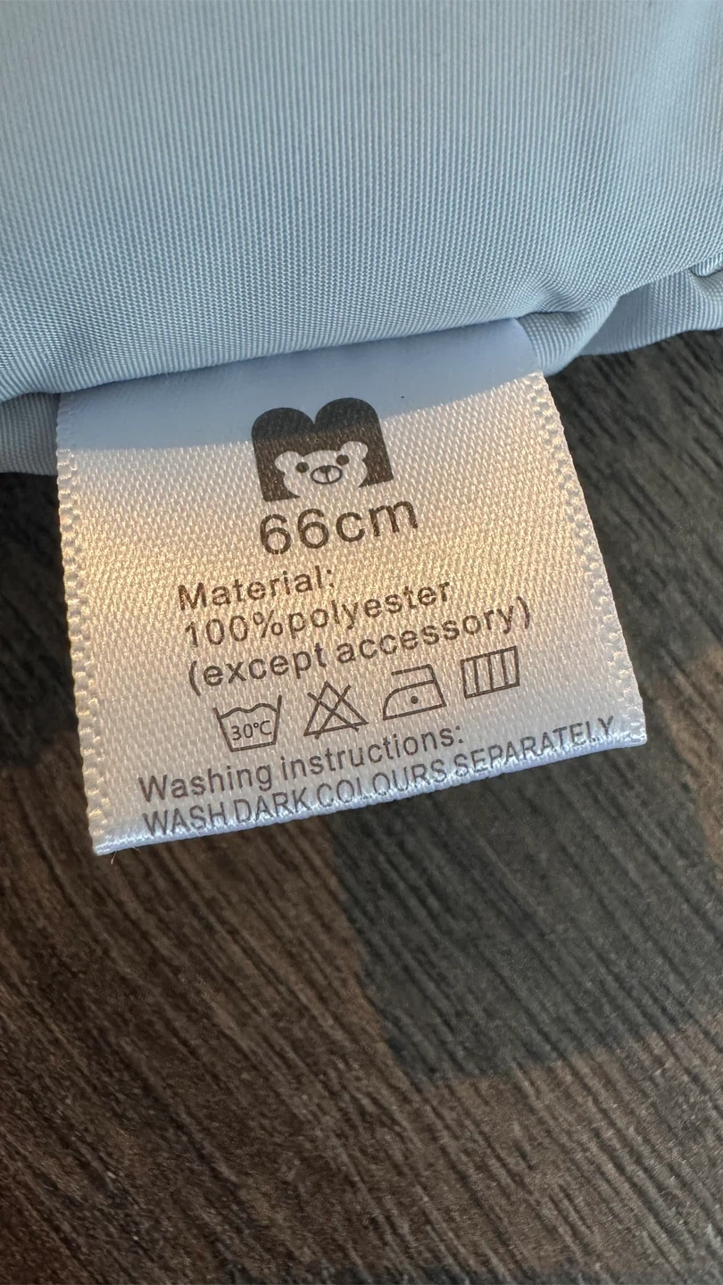 Selling a Mocheng baby snowsuit. It's a light blue colour with a faux fur trimmed hood and comes with matching mittens. The size is 66cm and it's made of 100% polyester. The product model is M-romper.