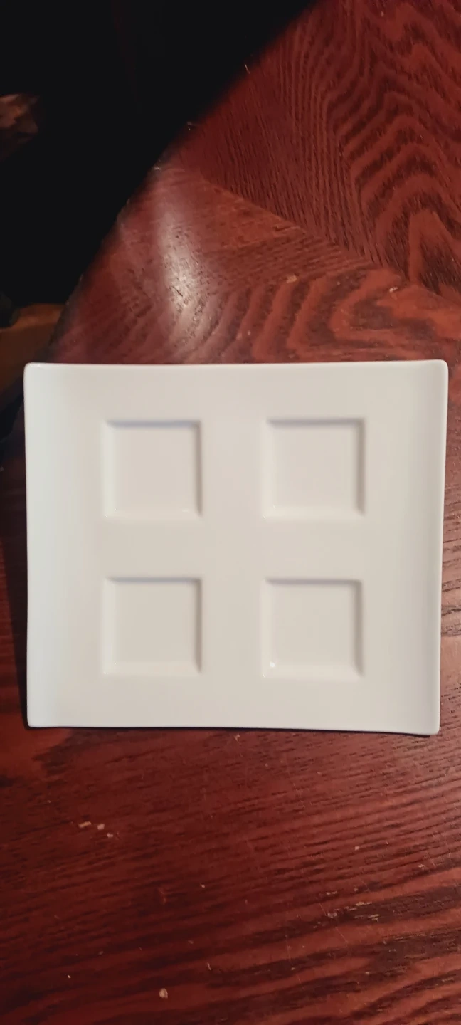 New !!! This white rectangular plate features four embossed compartments. It's made of ceramic material. This dish is perfect for serving appetizers or sushi π£ or snacks ! 8"Γ7". ( I have more of these plates). New !! ALL MY PRICES ARE NEGOTIABLE !!