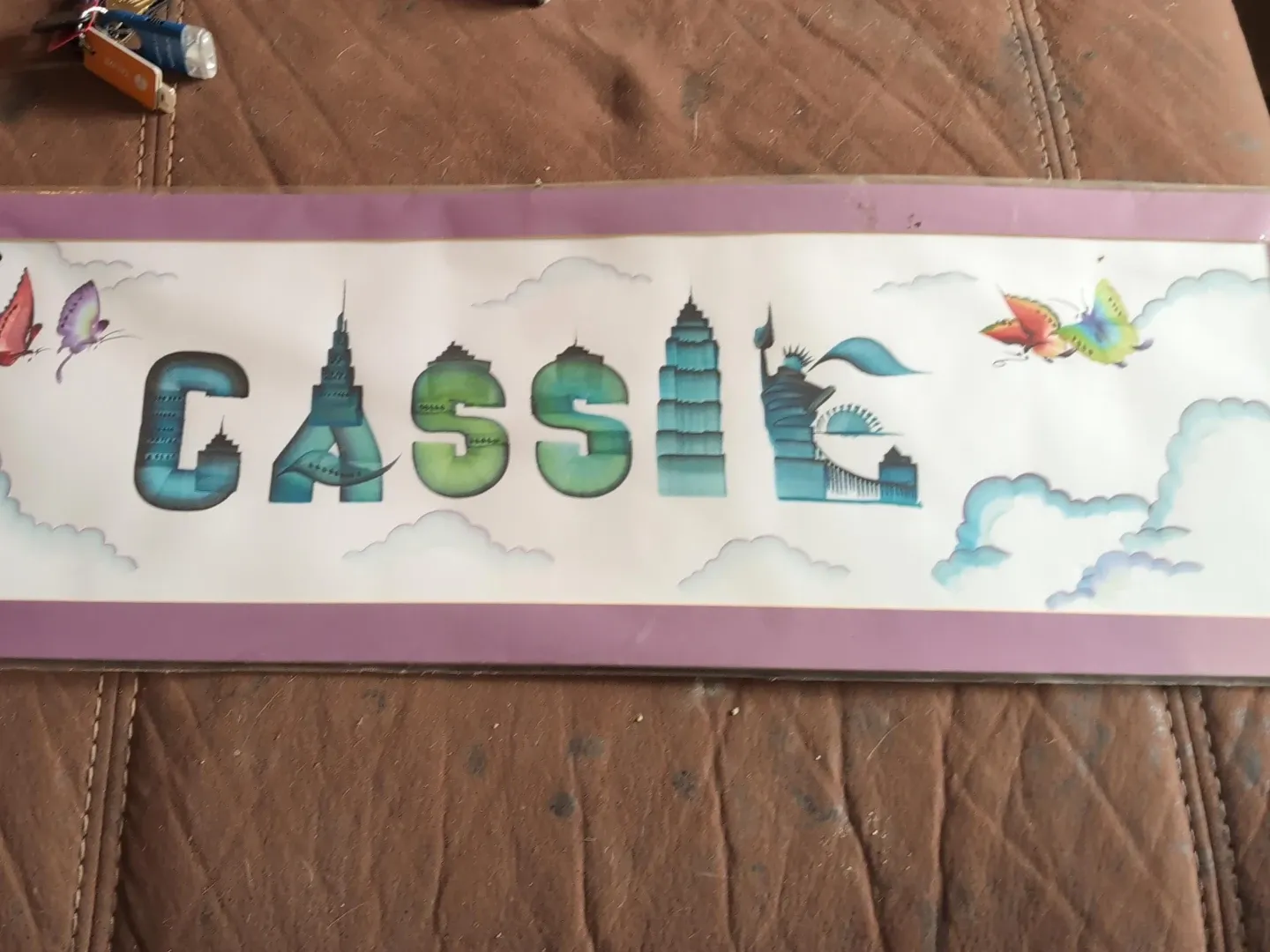 Decorative personalized name art featuring the name Cassie. It's designed with New York City skyline elements and playful butterflies. This piece is perfect for any bedroom or as personalized decor!