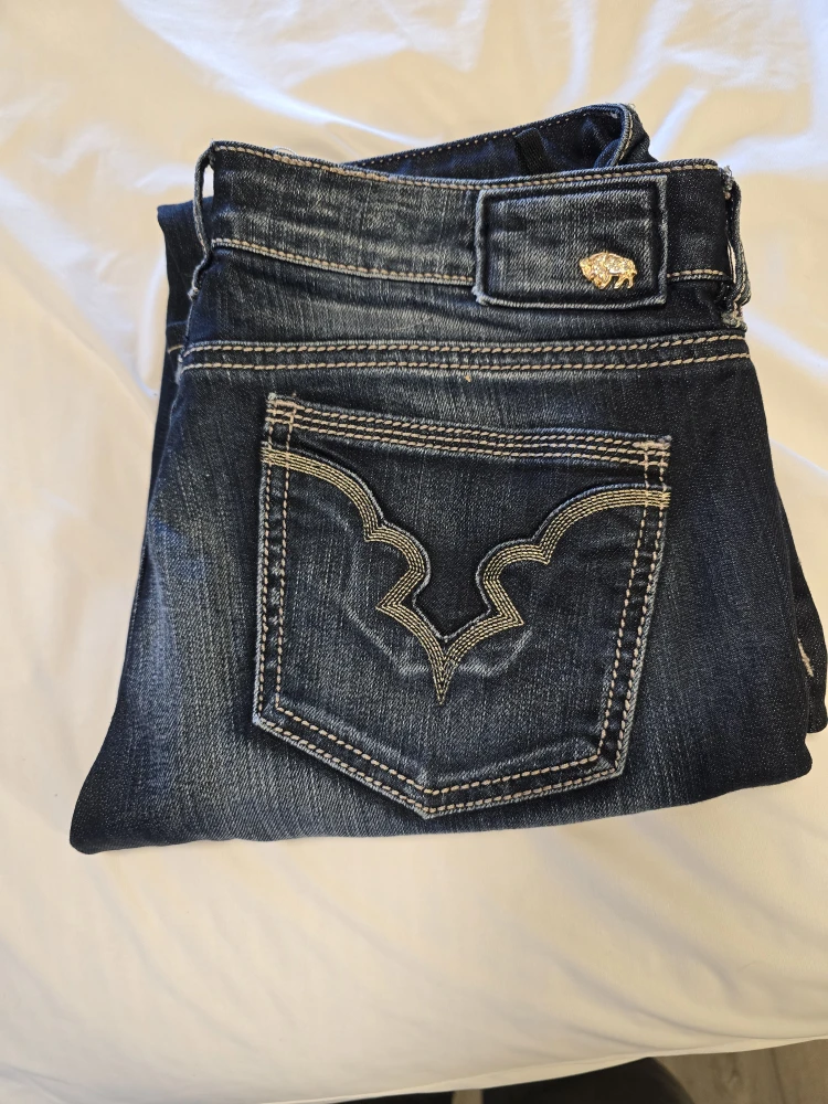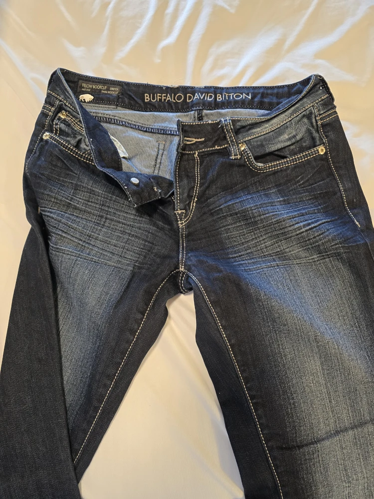 Here are some Buffalo David Bitton Willow bootcut jeans! They're in great shape and ready for a new wardrobe. The jeans feature a stylish back pocket design and the classic Buffalo logo. Perfect for a casual or dressed-up look!
