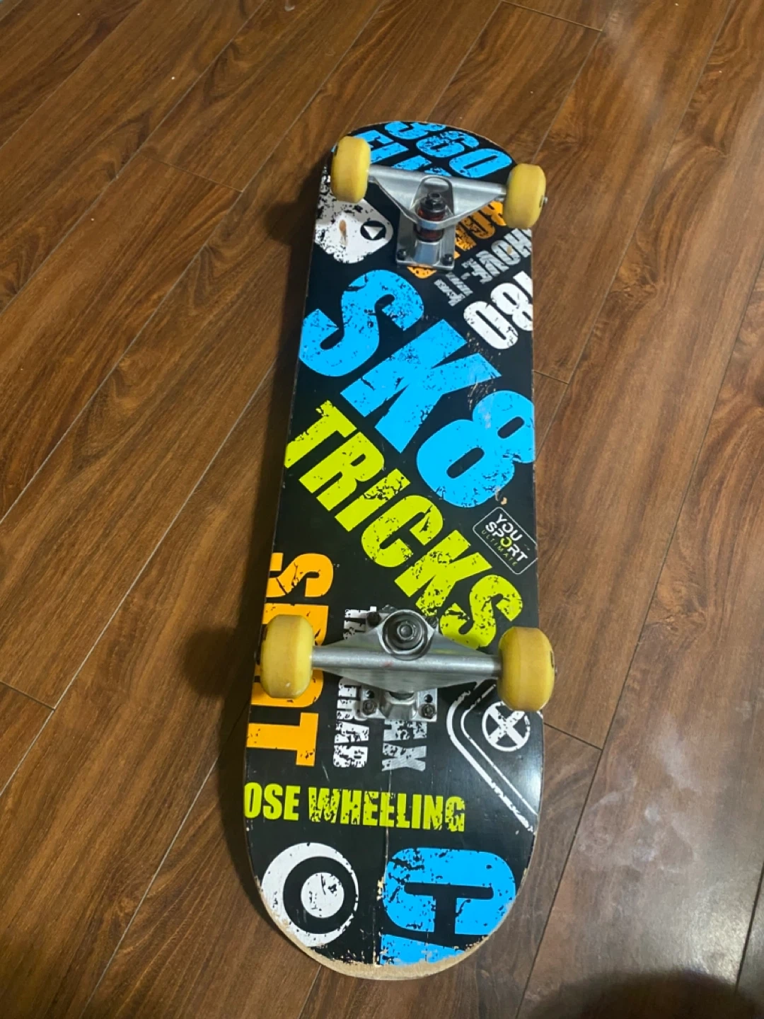 Selling a used Vokul skateboard. It has some wear and tear but is still a great ride! The board features a black deck with a yellow Vokul logo.