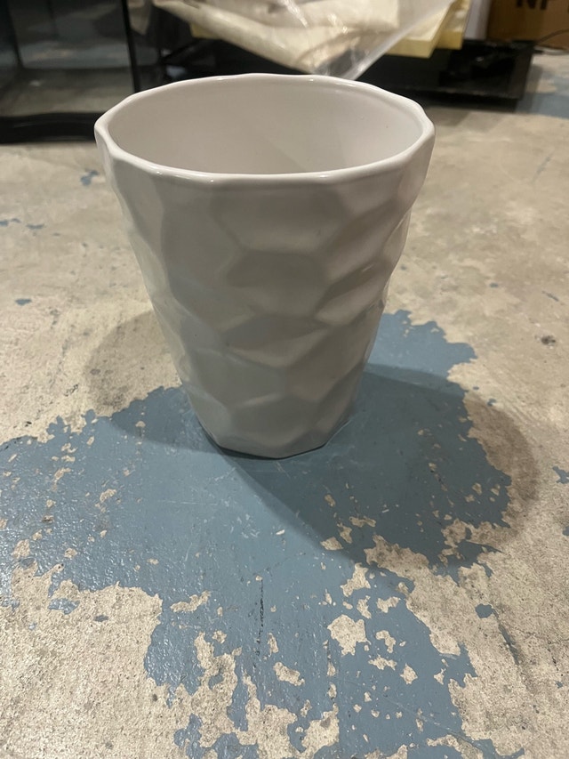 This white vase is perfect for any room! It is in good condition and would be a great addition to your home decor. Measuring 6 inches in diameter and 7 inches tall, it is the perfect size to display your plants and brighten up your space! Vases similar to this one sell for around $15-$25 on Kijiji. If the ad is up, it's available!
