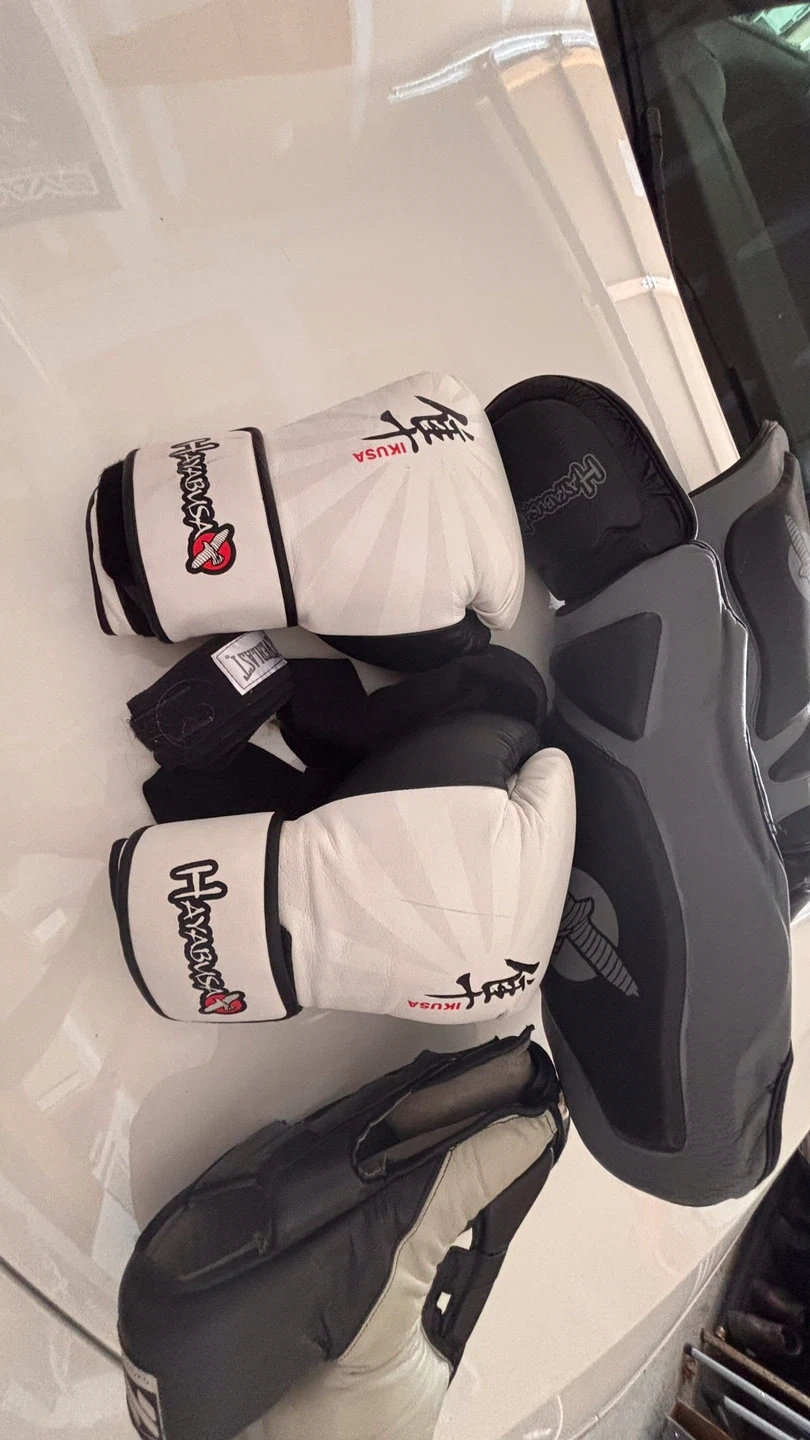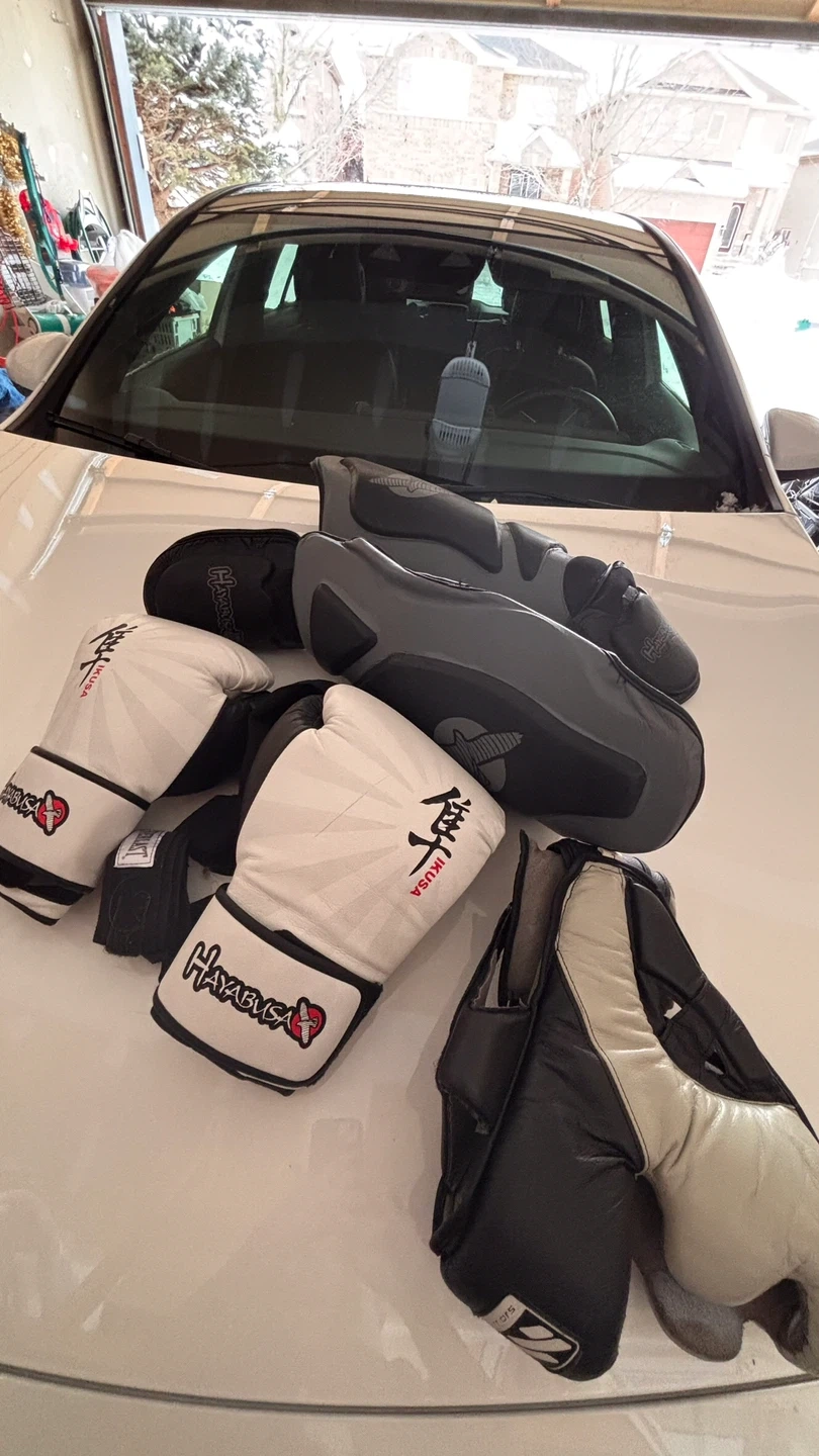 Hayabusa Boxing Gloves 16 oz, shine guards, and face guards