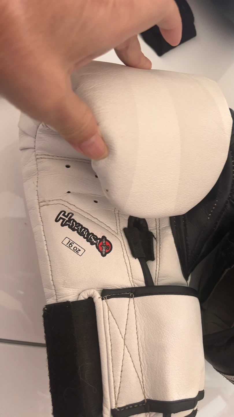 Pair of white Hayabusa boxing gloves. They're 16 oz. Includes hand wraps,