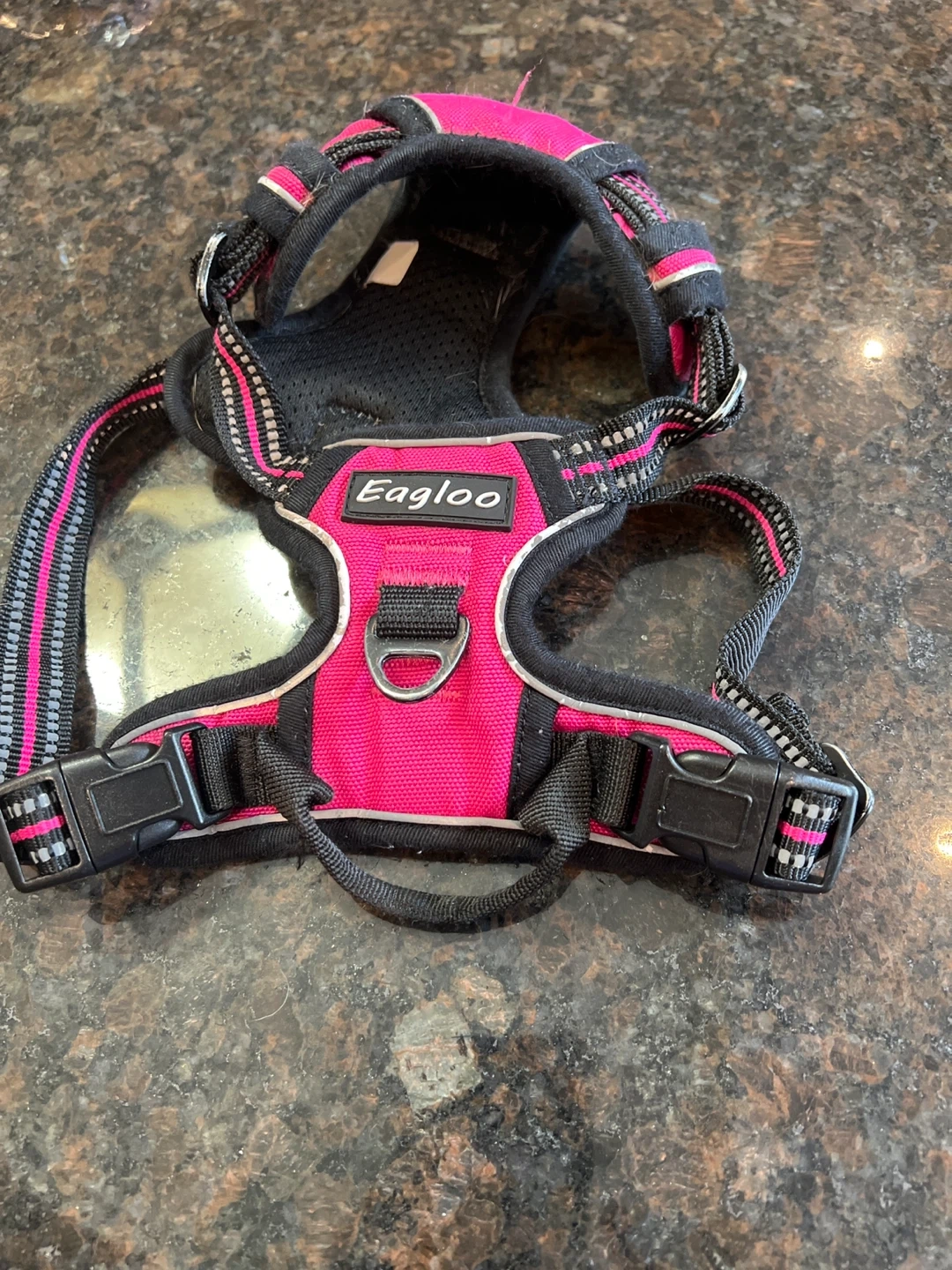 This is an Eagloo dog harness in a bright pink colour. It's made from a durable fabric with adjustable straps for a secure fit. Includes reflective trim for better visibility. Medium dog.