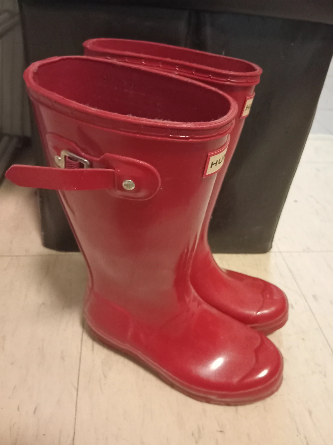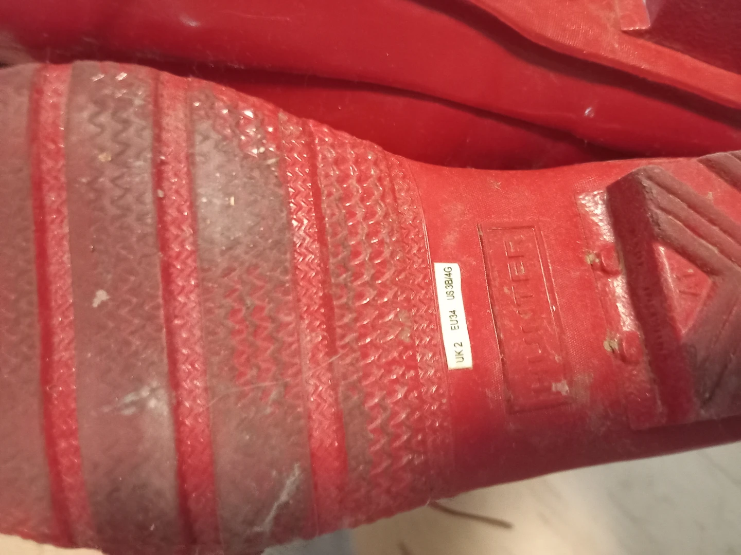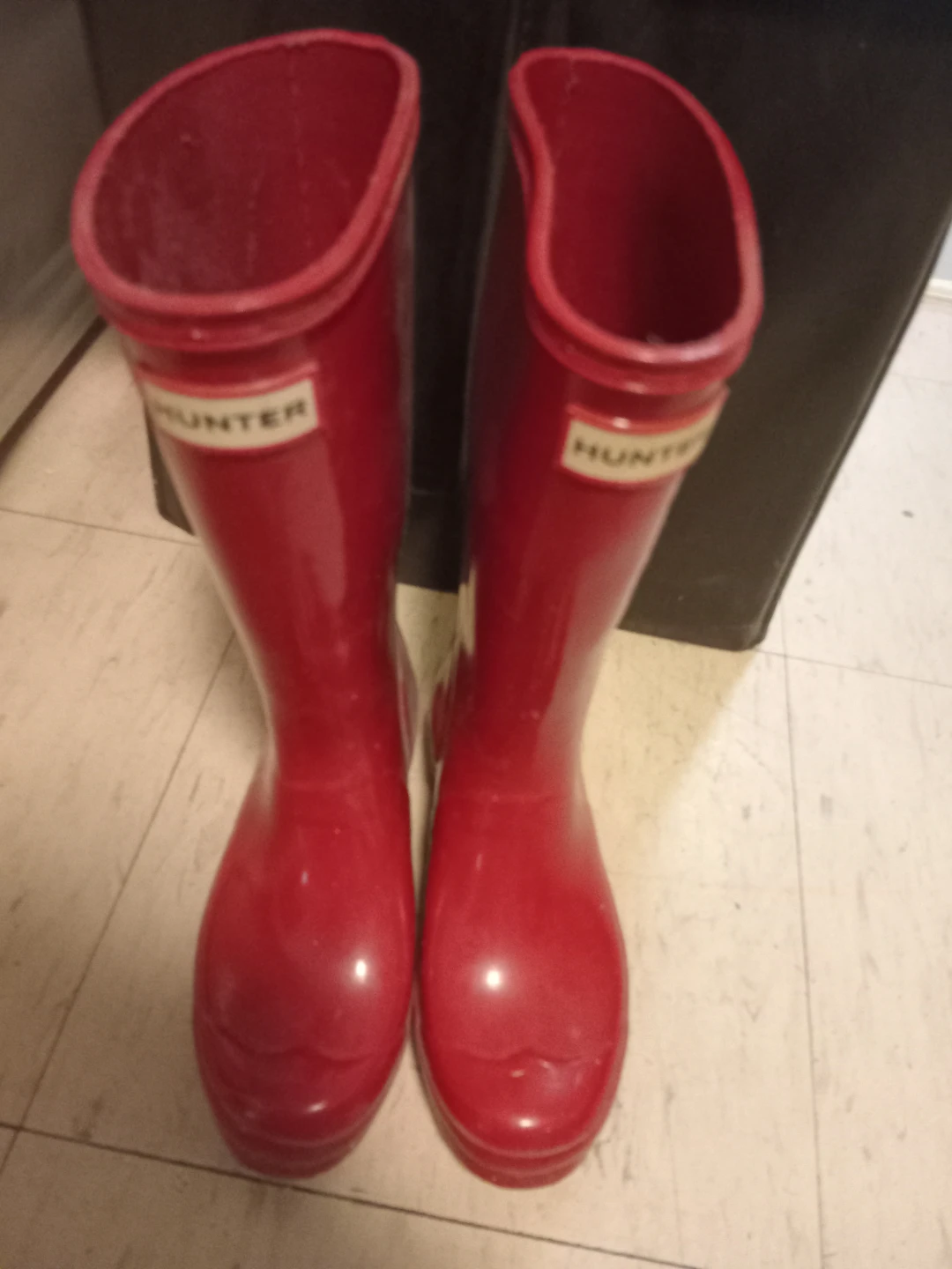 Selling a pair of red Hunter rain boots in women's size 6. They are in good condition and ready for some rainy day adventures! The boots are a vibrant red colour and feature the classic Hunter logo. Size is US 6, EU 36.
