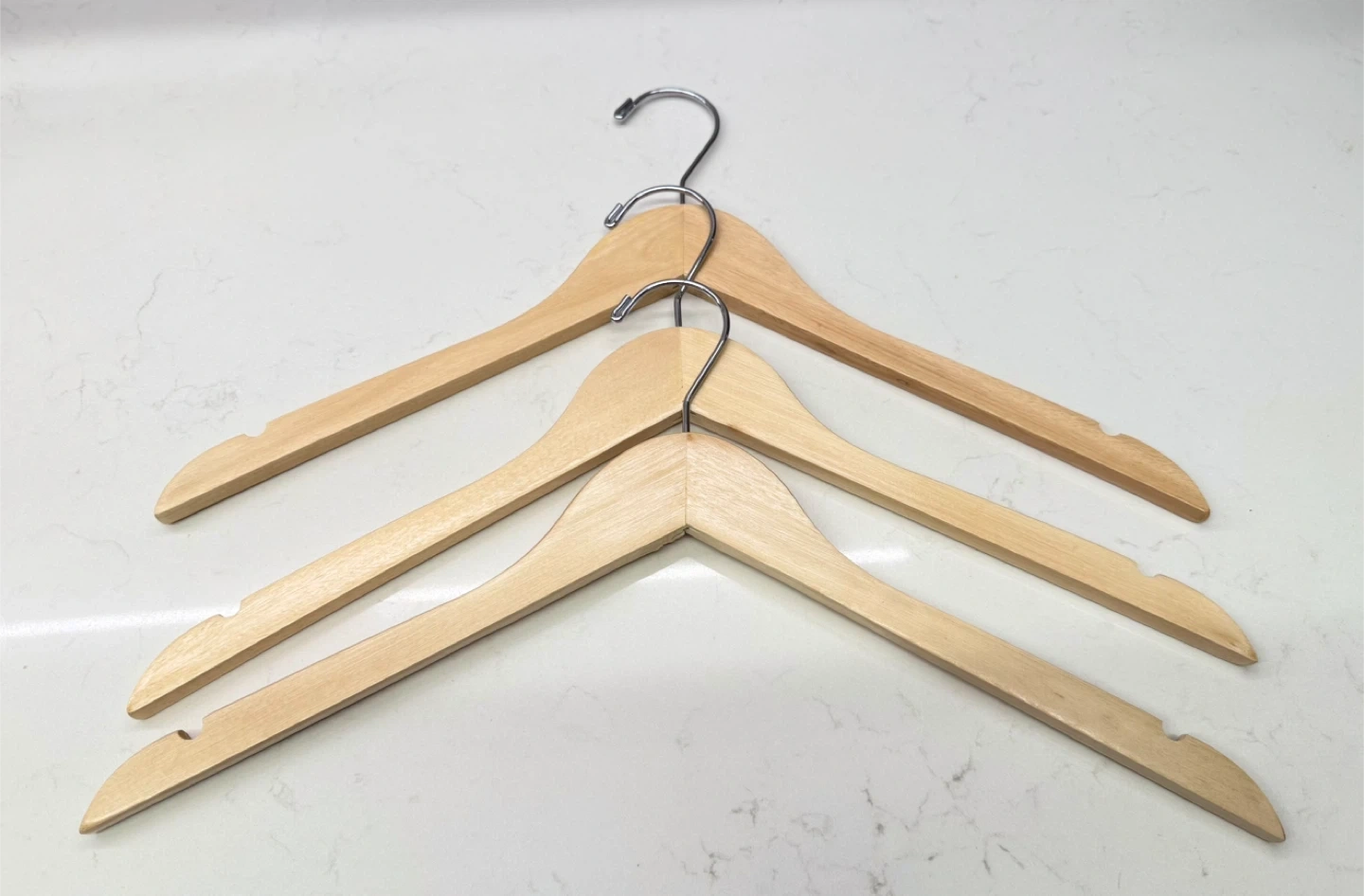 All natural wooden Jackets hangers. Each hanger has a smooth finish and a metal hook. Perfect for keeping your closet tidy.