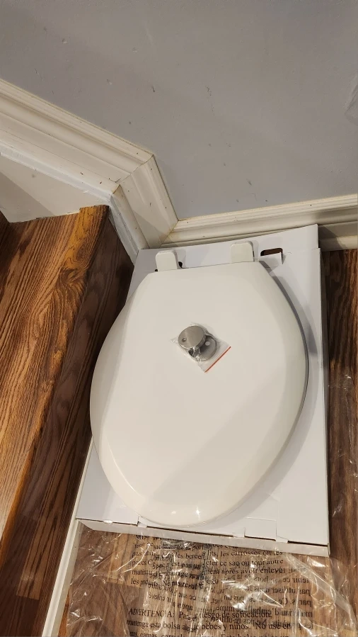 This is a white toilet seat and lid. It comes with the necessary hardware for installation. It's a standard size for most toilets.