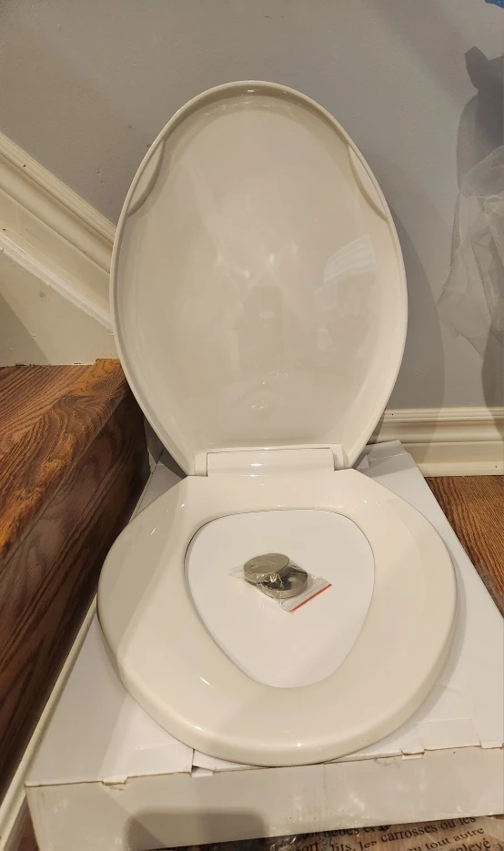 This is a white toilet seat and lid. It comes with the necessary hardware for installation. It's a standard size for most toilets.