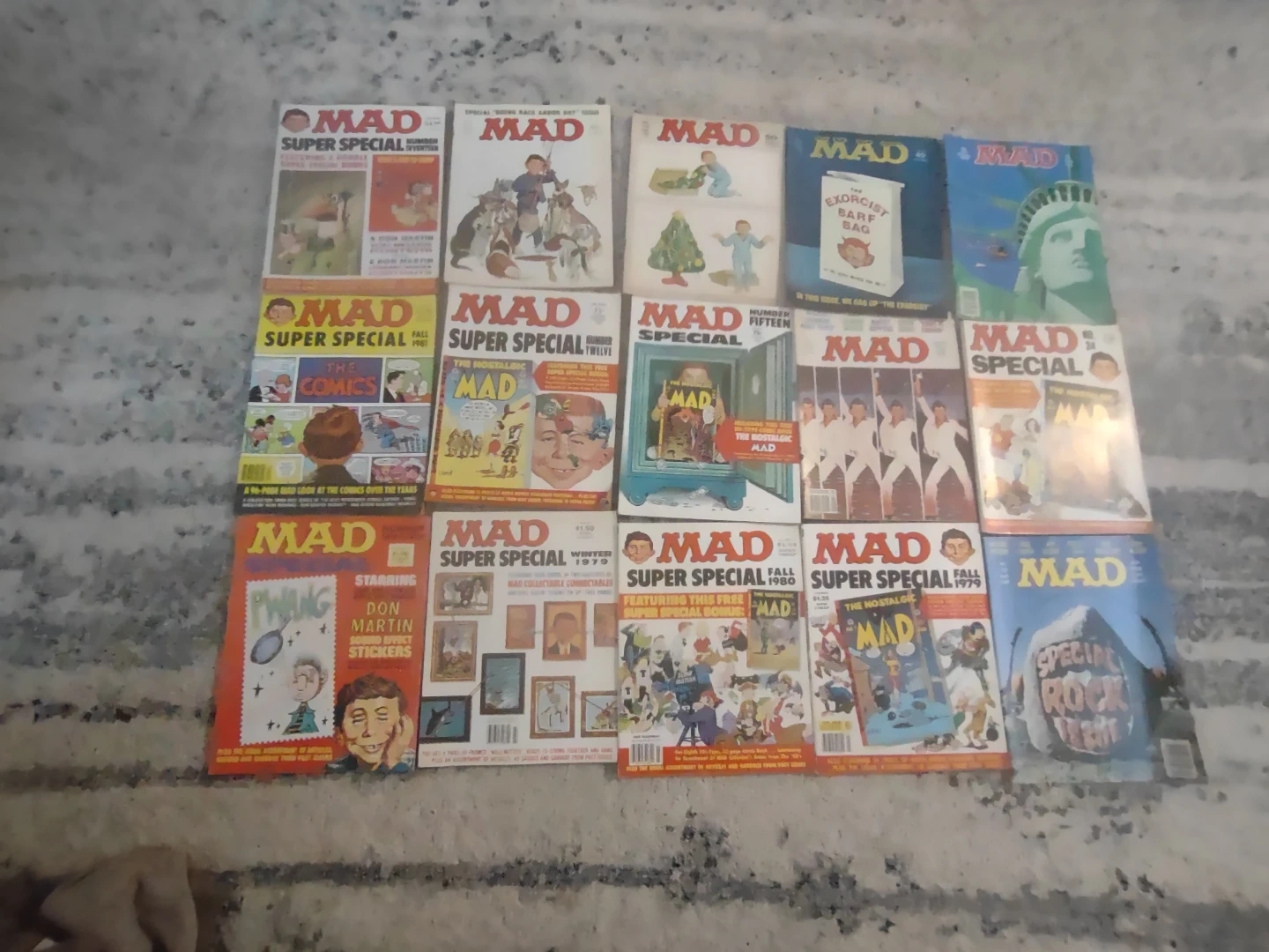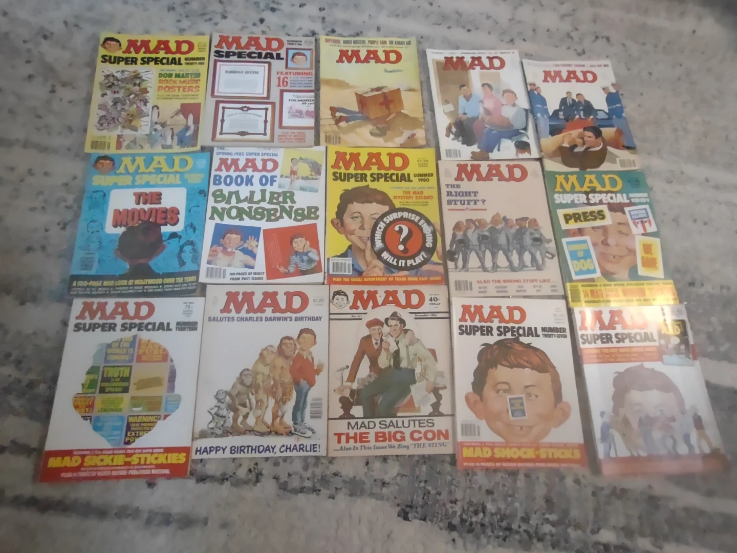 A collection of MAD Super Special and regular MAD magazines. Features various classic MAD content and artwork. Perfect for collectors of satire and humour publications.