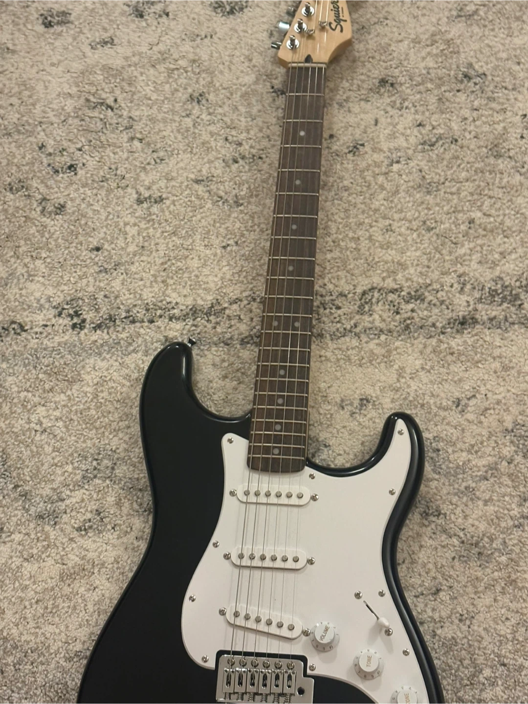 Complete electric guitar starter pack. Includes a black Squier Stratocaster guitar with white pickguard and a Fender Frontman 10G amplifier. This setup is ready for practice or jamming!