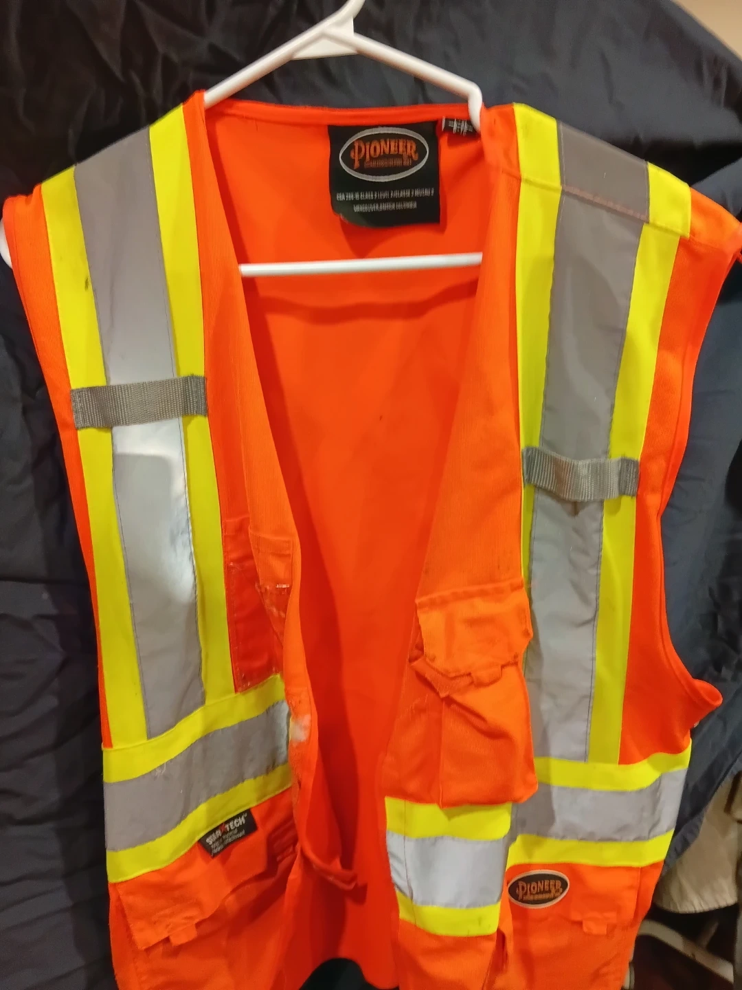 This is a bright orange Pioneer hi-visibility safety vest. It's designed with reflective strips for increased visibility. Multiple pockets are included for convenient storage.