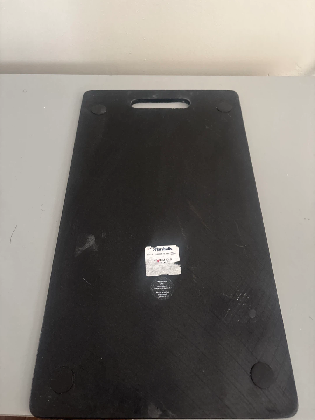 This marble black cutting board has a built-in handle for easy carrying. It's made of a durable marble . Non-slip feet on the bottom keep it stable during use. Great for everyday food prep!
