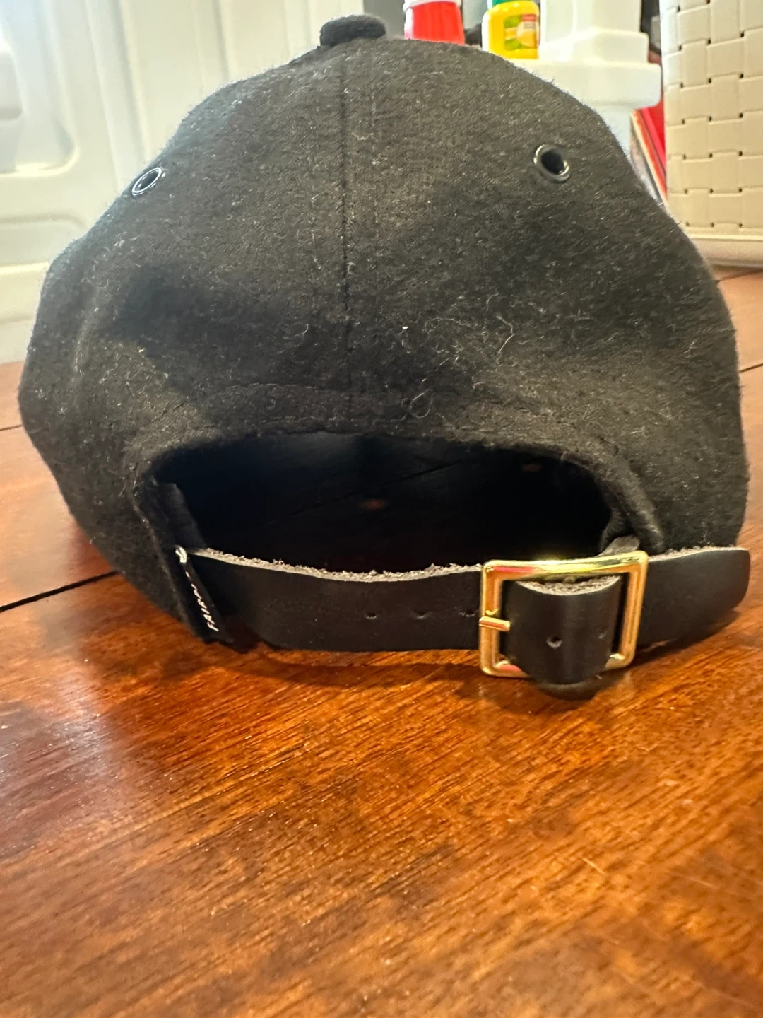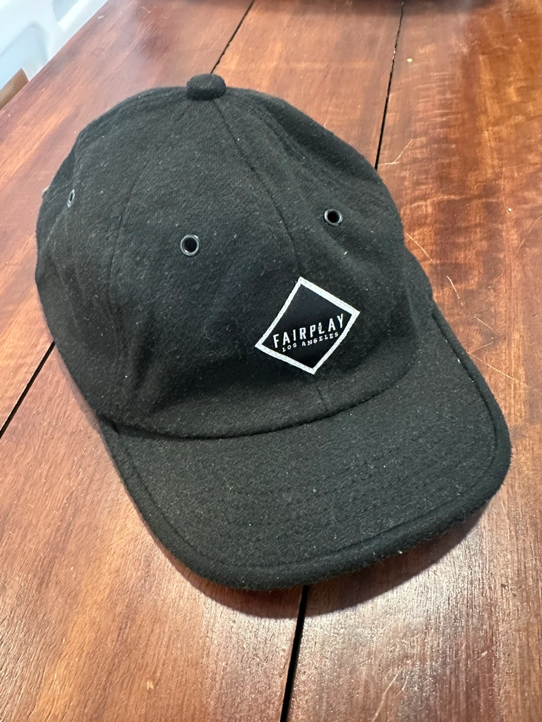 This is a black baseball cap from Fairplay Los Angeles. It's made with a wool blend and features an adjustable leather strap with a gold buckle for a customizable fit. This cap is suitable for everyday wear.