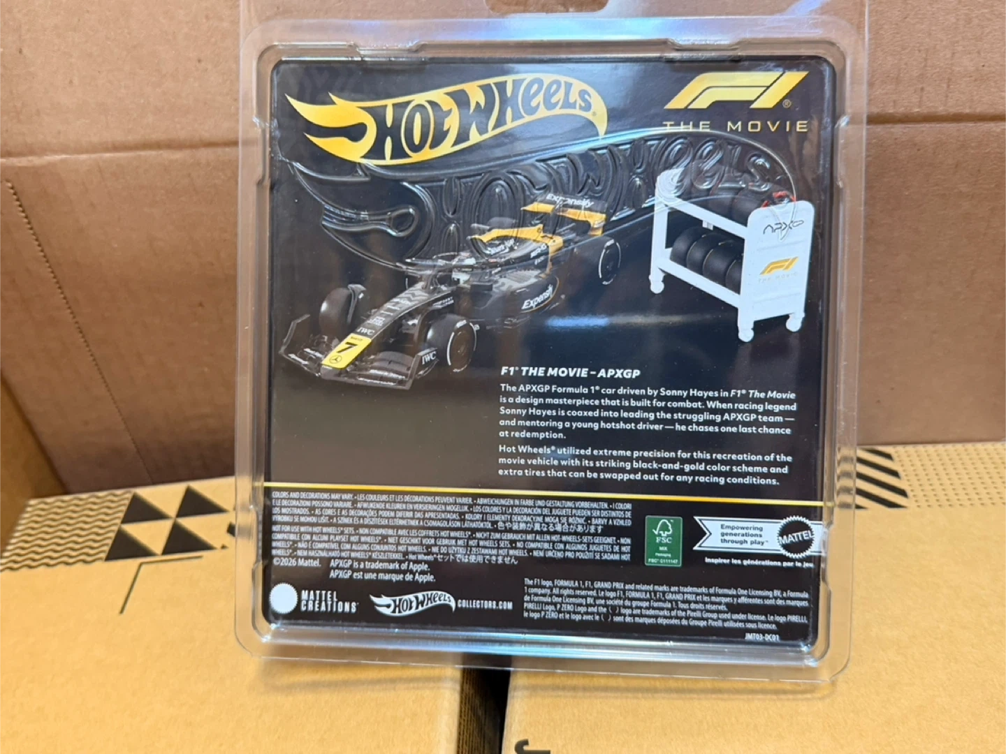 This is a Hot Wheels F1 The Movie APXGP die-cast car. It's a highly detailed recreation of the Formula 1 car driven by Sonny Hayes. Includes a miniature pit crew tire rack.