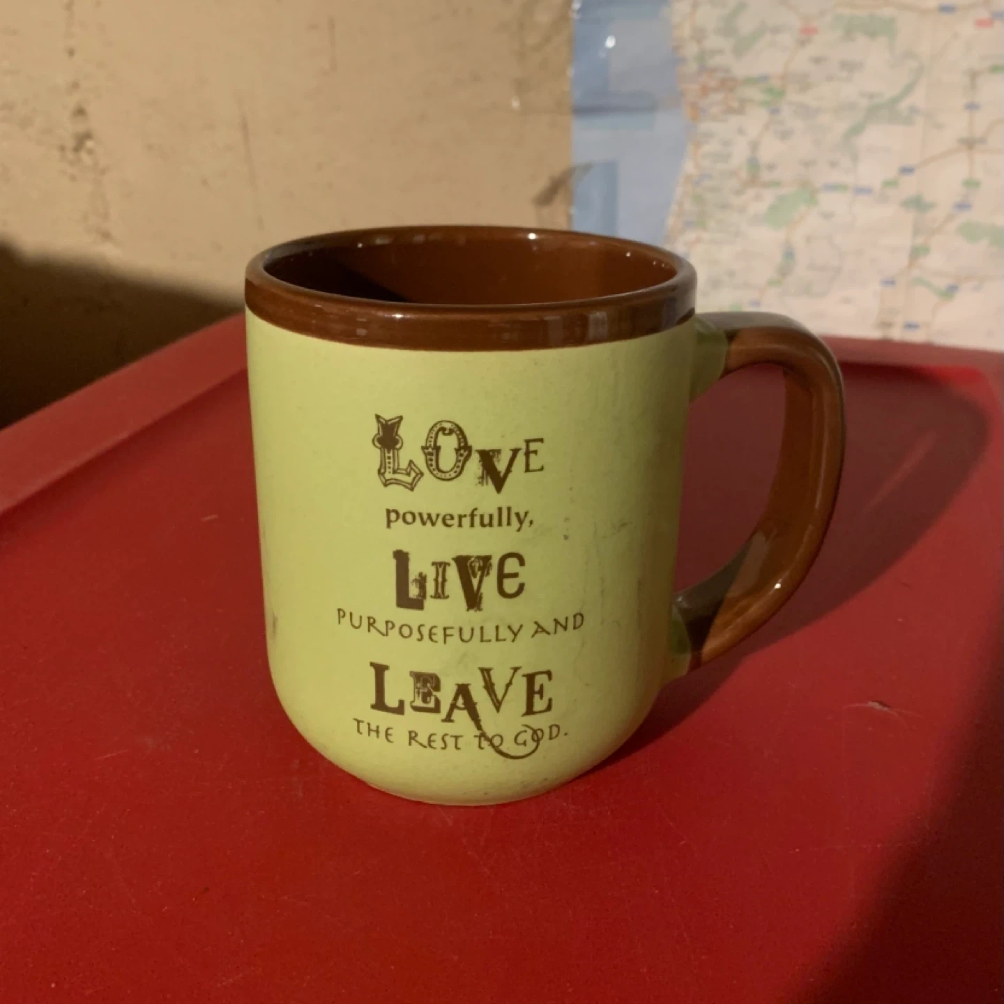 A cute mug with the words 'Love powerfully, Live purposefully and Leave the rest to God' printed on it. It's perfect for your morning coffee or tea!