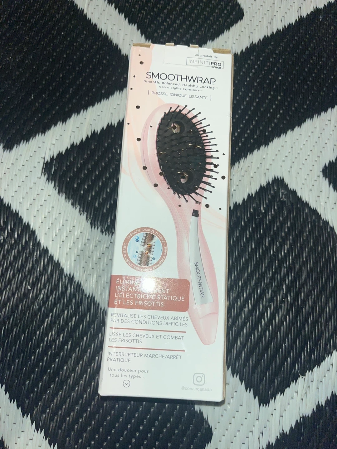This is the Conair InfinitiPro SmoothWrap Smoothing Ion Brush. It revitalizes your hair from harsh environments and combats frizz. It features a convenient on/off switch and is an indulgence for all hair types.