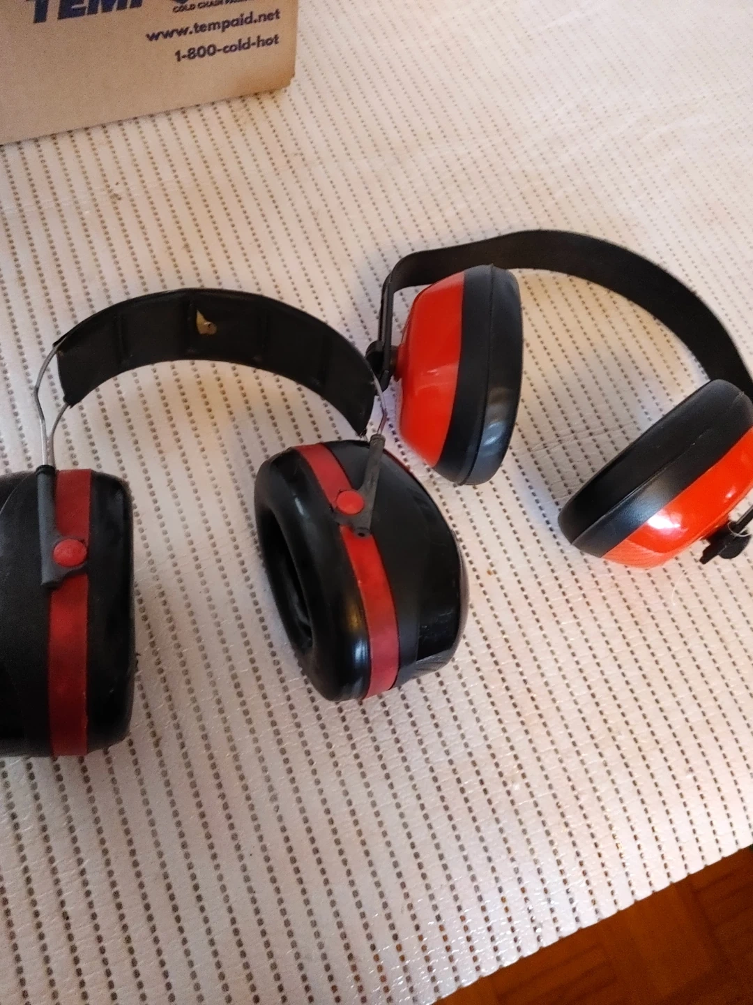AOSafety Professional earmuffs in red and black. They're designed for hearing protection. These earmuffs are adjustable for a comfortable fit.