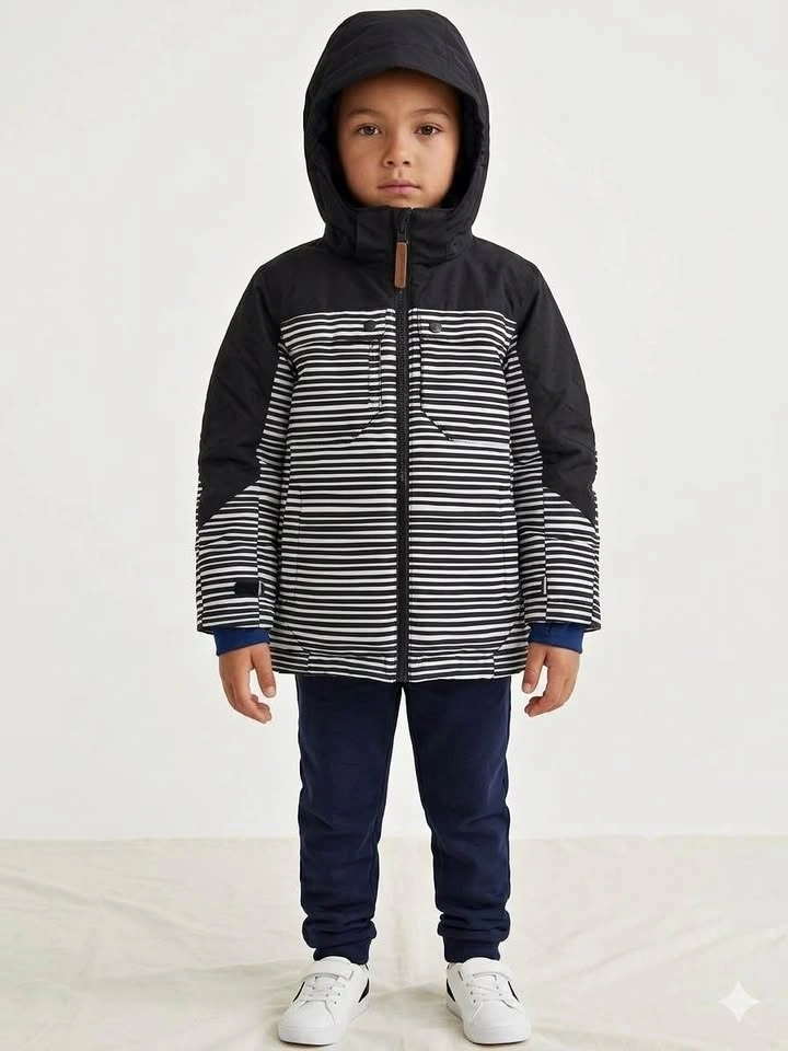 This hooded winter jacket has a black and white stripe design. It's perfect for keeping kids warm. It features a full zip and a hood.